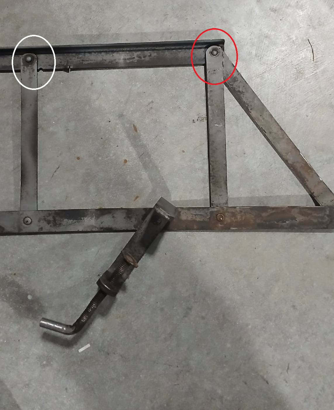 The fact that the lower rivets for the uprights are on the inside of the horizontal piece and the rivets on the upper horizontal piece would allow for a flush fold down to the floor board. If they were both on the same side the upper horizontal piece would rest on the lower one when it was collapsed, not flush as others described