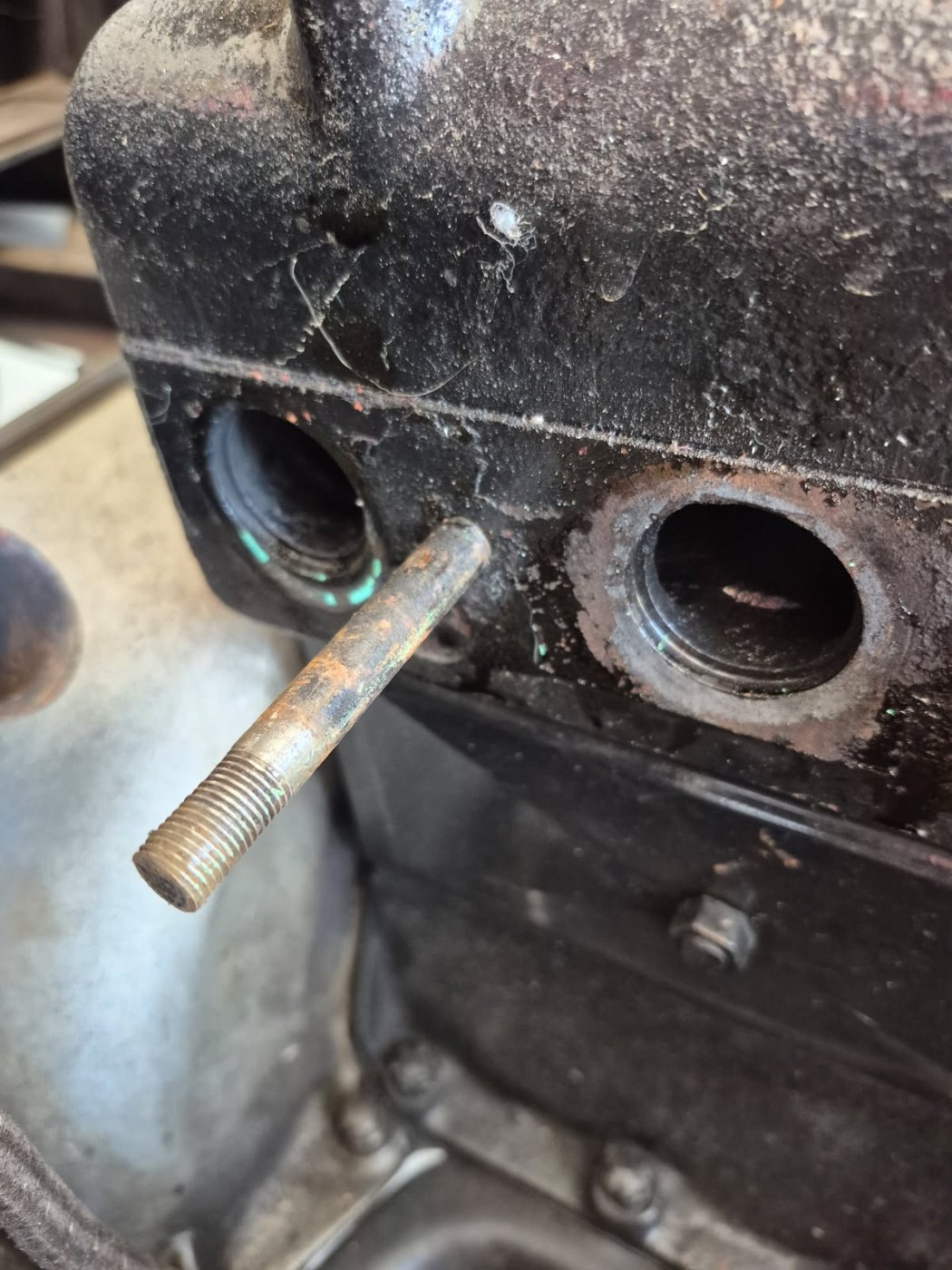 Initial goal being to check valve clearance, I (quite literally) yanked the manifolds...which were stuck. Ended up being the typical warped exh manifold, which was 1/16" off plane on #3 and 1/4" off on #4. The prior assembly was done by placing the sleeve rings in the manifold and torqued down to cut into a thick gasket, but, that wasn't good enough so they were slathered in form-a-gasket which became a sticky tar glue!!! Interesting too a noted scratched "X" in the head above the offending port. New manifold on the way, tar removal in progress.