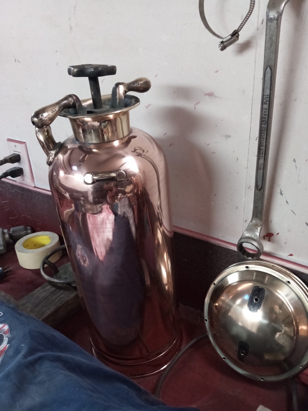 That's a nice looking fire extinguisher. Until about 60 years ago, they were commonly filled with carbontetracloride. The FRX brand was made in my childhood hometown.