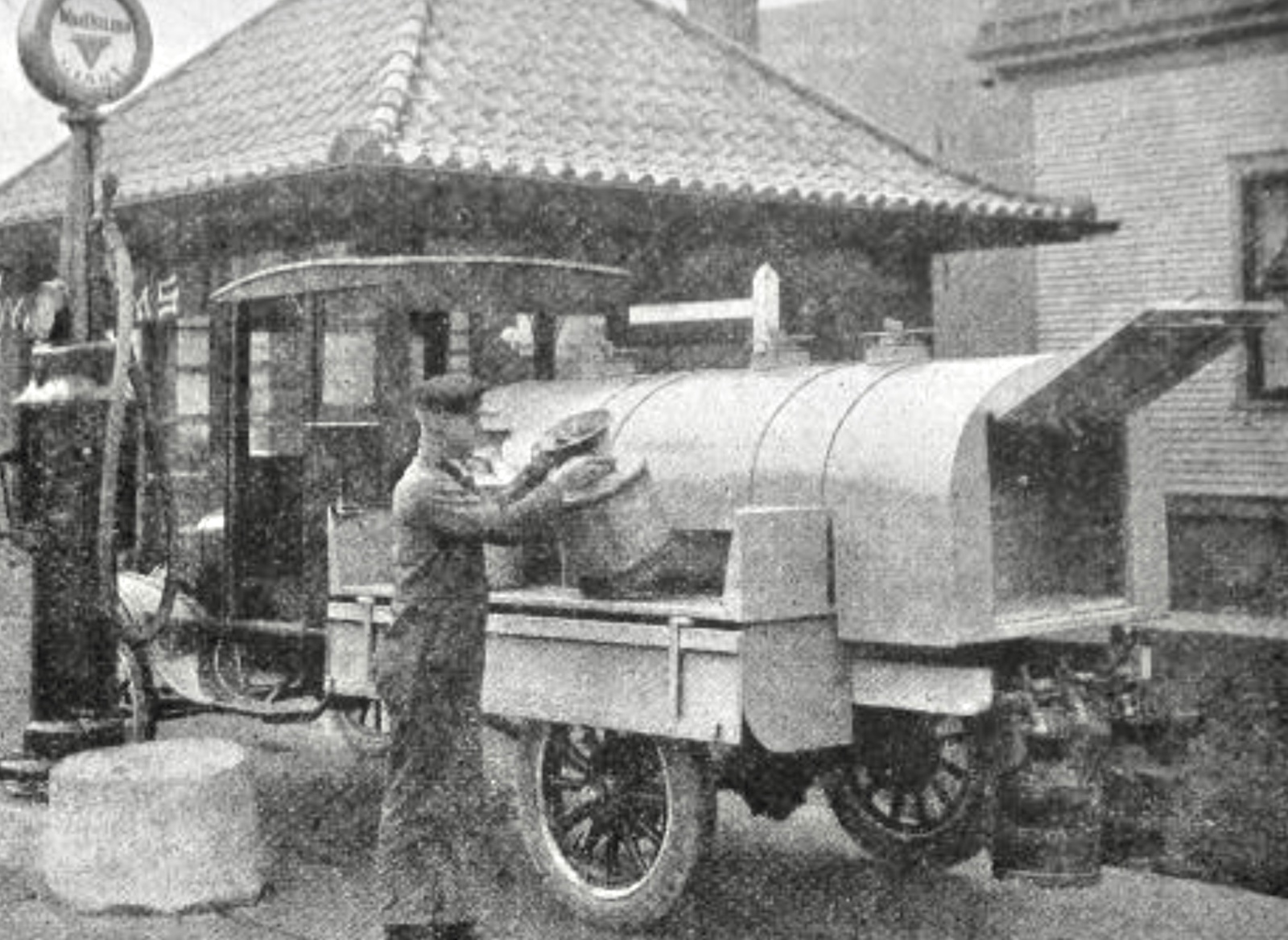 What's in the "dog house" on the rear of a 20's fuel truck. I picked up a small oval fuel tank several years ago at Hershey with the thought of building a roadster delivery truck.... kind of like the little Ertle models. I know the later ones had a pump with a hose reel in there. Did the early ones have some configuration of that? Hand pump? I've been looking for a picture of one with the doors open, but no luck. It's been hard enough just getting to see a rear shot.