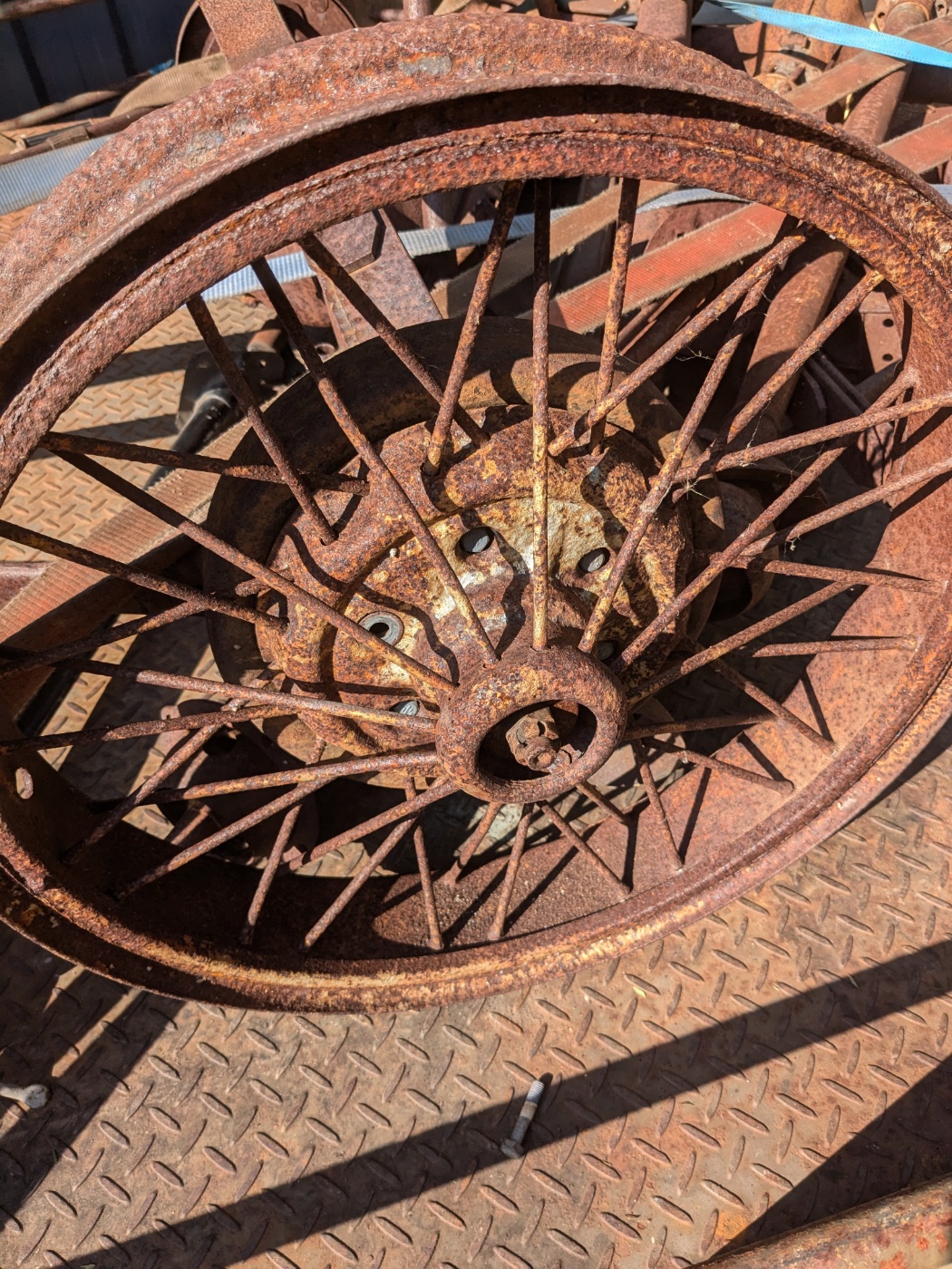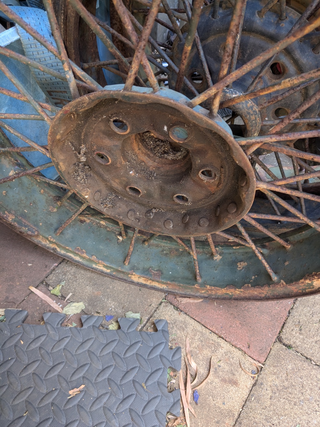 Hopefully someone from the Model T "brains trust" can shed some light on these wire wheels which were attached to a 1927 T rear axle in some parts I collected this week. At first they looked like Model A wheels but they are clearly not. They are six lug bolt on wheels with welded spokes onto split ring rims. The rims are 20inch. The spokes are welded on the rim but poke through the hub. The six stud holes match the wooden wheel stud pattern on a Model T hub which is obviously why they were used on the T axle on a farm. The wheels were not attached with proper wheel studs or nuts. The hubs are like a more stubby Model T or A hub. They are quite neat wheels (three of the four seem good) so I thought I might use them on my T racer. They may be an easy fit. Once I know what they are, I can maybe track down a better fourth one, but for the moment, they are a bit of a mystery to me. Appreciate anyone's thoughts.