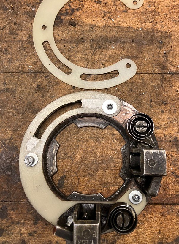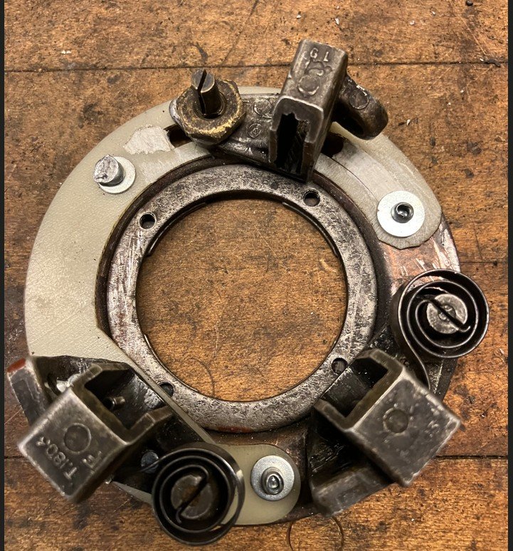 My goal was to preserve it for the next caretaker instead of modifying it to fit the later parts. I was able to clean the Glyptal of the plate and fitted new insulators. The later design insulator is similar but needed some revisions. For one, the early third brush would ground at both extremes of the travel. One end of the insulator was close to the grounded large brush holder and there was no rivet hole there. I used Apoxie, a two part epoxy clay. It's water soluble while working and is solvent proof and heat resistant when cured. I used The fiberglass insulator has its slots changed to one slot and it's now shortened so it lines up with the existing rivet hole.