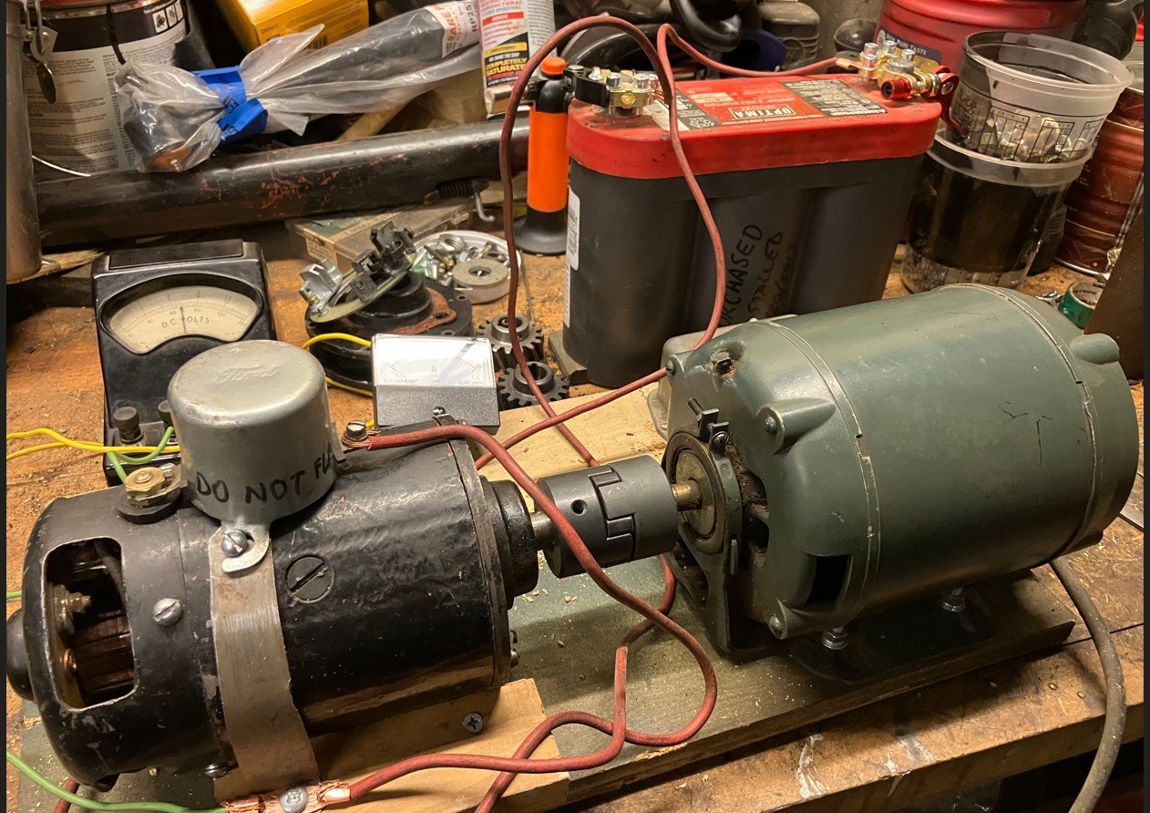 With the brush plate adjusted and third brush retarded, I am seeing nine volts at four amps. After adjusting everything, I checked it with my volage regulator instelled. With a charged battery, I see a six amp spike which tapers back to zero with no load in the system.