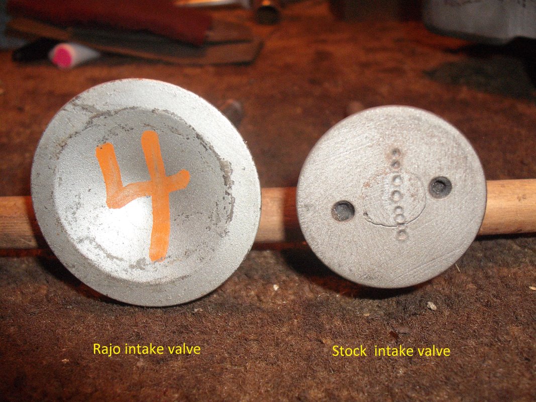 I have heard that the Rajo 4 valve heads are the same CC or compression ratio as a stock head. But to my eye it just looked to be larger. So to ease my mind I did an old school CC test. I leveled the head, put in the spark plug and filled it as full as I could get it with water from a large syringe marked in CC measurements. The Rajo measured to be 295 CCs and then the stock model T head measured to be 315 CCs. In reality I probably have an error factor of at least 20 CCs so I guess the Rajo and Stock head are the same. I also took some pics of the Rajo intake valve compared to a stock model T intake valve.... A huge difference !!! The old girl should be able to breathe very good ...