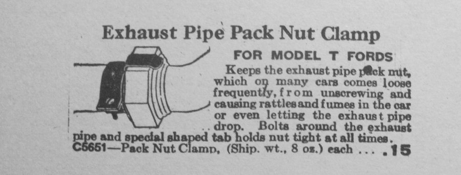 Steve Jelf wrote: ↑Mon Mar 31, 2025 12:09 amIn the Model T Ford Club of Facebook somebody asked how to keep the exhaust pack nut from backing off. There were the usual suggestions, including clamps for the purpose sold by Lang's and Snyder's. That made me curious, and I looked into the 8-5-28 parts book everybody has. It shows no such clamp. Why didn't Ford provide that product back in the T era?
