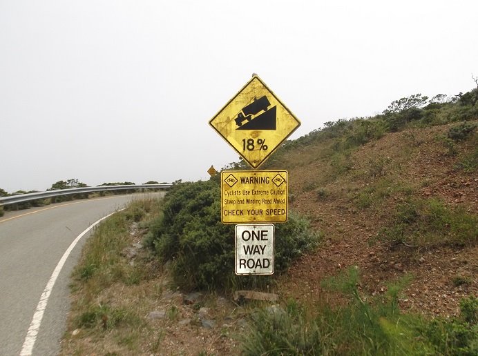 From Mill Valley Travelodge: into the Marin Headlands, Golden Gate National Park, Fort Cronkhite, the Marine Mammal Center, Golden Gate Bridge Overlook, and back through Sausalito. ...and, if you dare, Larry Smith’s **optional** reckless, irresponsible, and death defying cliffside one-way 18% single lane downhill grade (with no shoulders) “suicide loop” out over the freezing and shark infested Pacific Ocean and past the radioactive(?) Nike Missile Silos. Then, a BYOB cocktail party back in motel parking lot, 5PM.