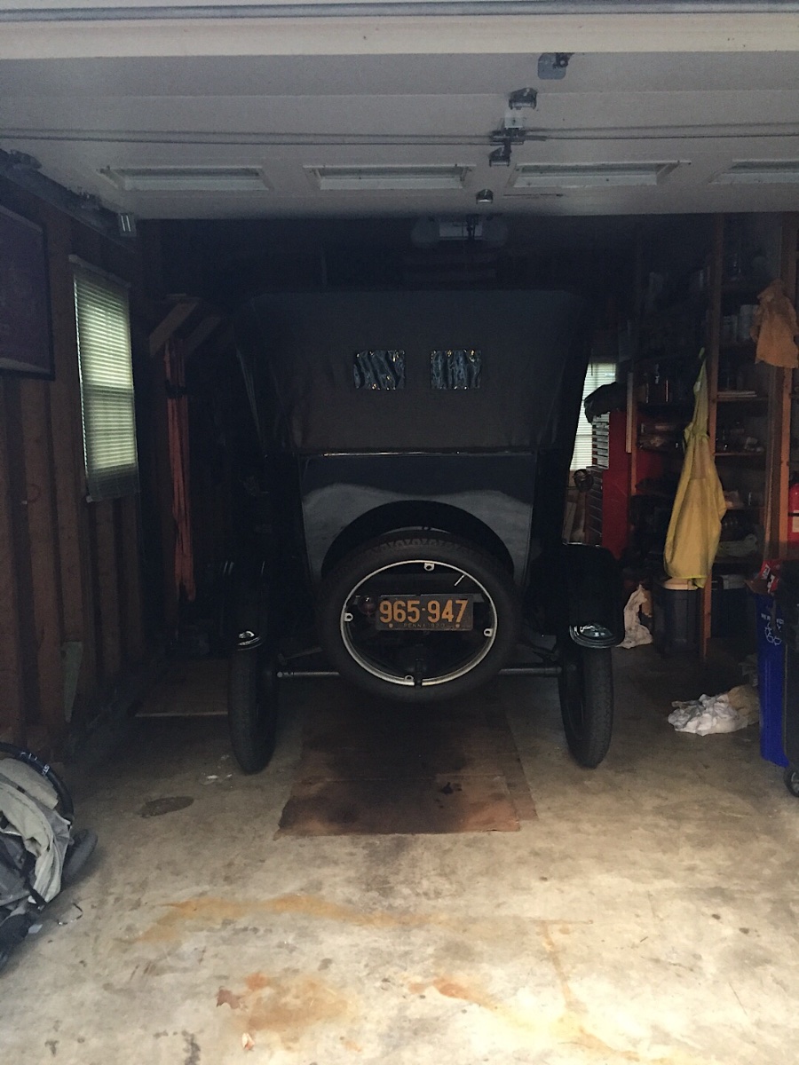 Well I really can’t believe this, but tonight I tried to put the Model T into the garage with the top up and to my disbelief it fits. I must have taken bad measurements or received some bad anecdotal advice at some point. Had a spotter and pushed it it ever so slowly and it clears by a few inches. If it clears a few inches, it clears a yard!