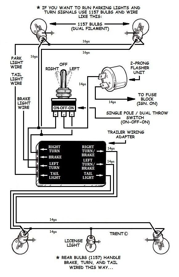 Here is a wiring diagram that can be integrated into the T wiring. It includes a black box (tail light converter - designed for trailer connections) to simplify the wiring to the tail lights if you have dual filament bulbs. I roughed out a diagram of the black box wiring to show what it does. Also if you are using LED Bulbs you need to get a Flasher that works with LED bulbs