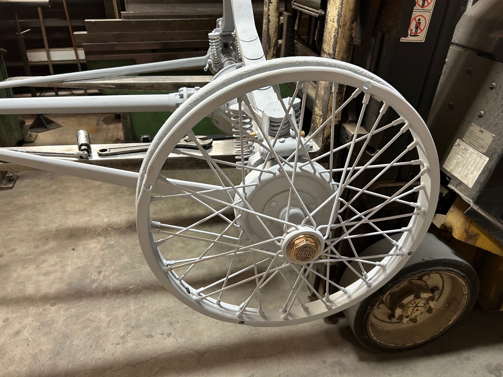 I picked up a set of Hayes Wire wheels from a fellow member on this forum. He was helping a widow sell surplus parts her husband had leftover. He said they looked pretty good, but didn’t really know anything about them. They looked to be in storage a long time. When I cleaned them I discovered they had been respoked and trued. They also came with a set of repo cast hubcaps, so I debured and polished them.