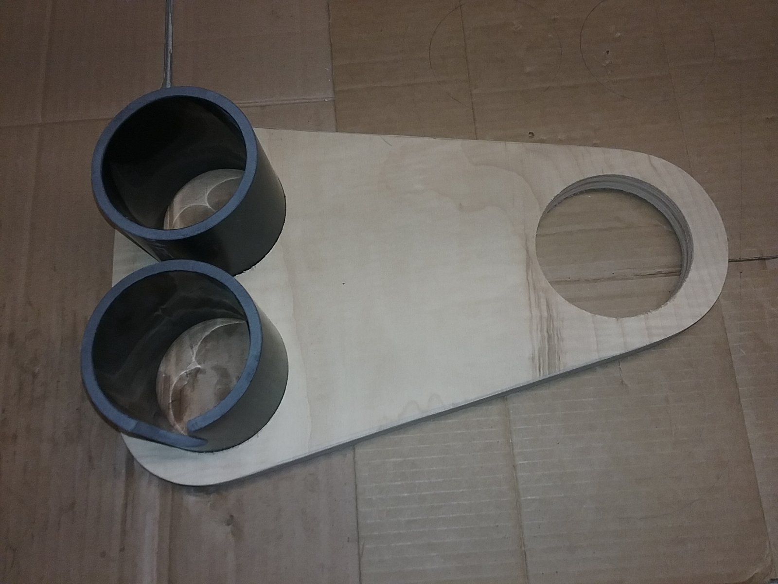 Dual cup/bottle holder. Scrap piece of plywood, a bit of excess black PVC pipe and a little time playing in the garage. This was before it got a coat of black paint. The open hole fits over the boot for my Chicago shifter in the speedster. Made another to fit in my Model A.