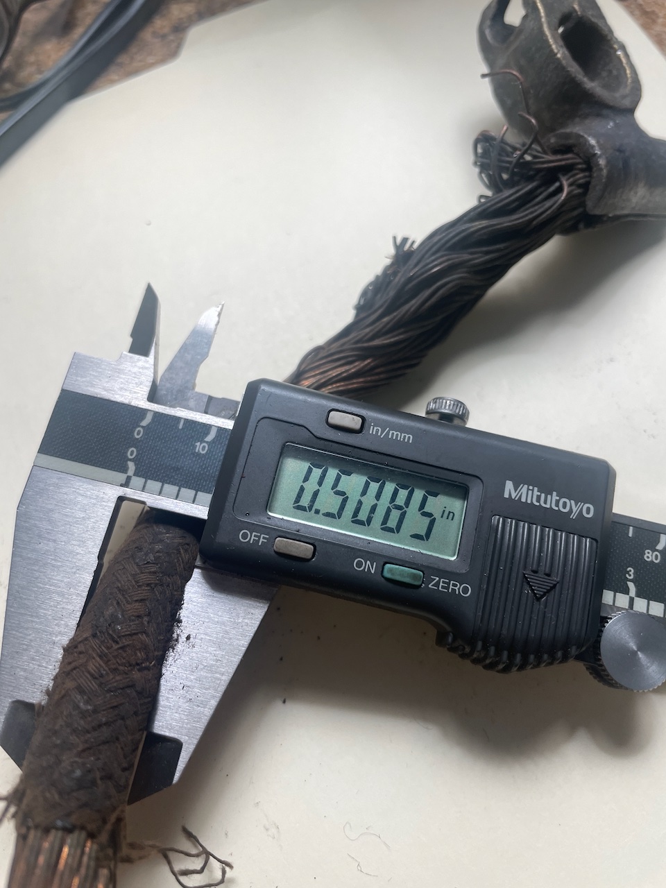 I checked an old Ford battery negative ground cable, Part # 5049B, Factory No. T-1890B that I pulled off a '23 chassis. This cable was used from 1919 to 1923, then Ford went to a ground solid flat strap (woven can be used too)..... This cable is 9 15/16" long, and I measure the OD as .500". The inside wires ID measure .0419".