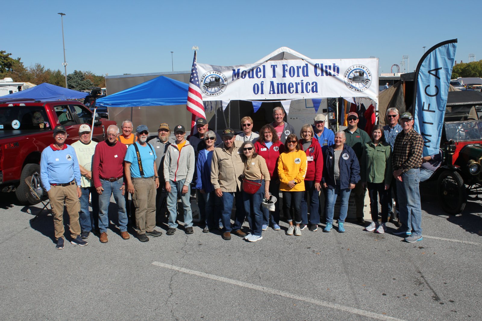 Welcome all to our tent in the North Chocolate field, C4Q 38-39. We have a transmission display and a demonstration of re-spoking wheels using the Reagan spoke press by George Akins at 10:00. Information on front end alignment will be done through the day. Come for coffee and donuts in the morning. Meet our Board and spouses, Cari, and Michael our editor. Shirts and merchandise are available. George's car and Model T camper are on display.