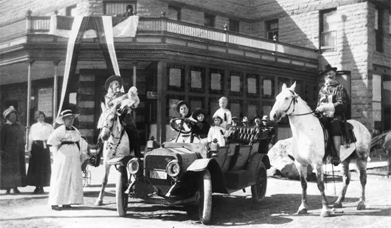 Buffalo Bill Cody named the Hotel after his Daughter Irma in 1902. The White Touring Car is certainly a Model T era vehicle. The license plate suggests 1913.