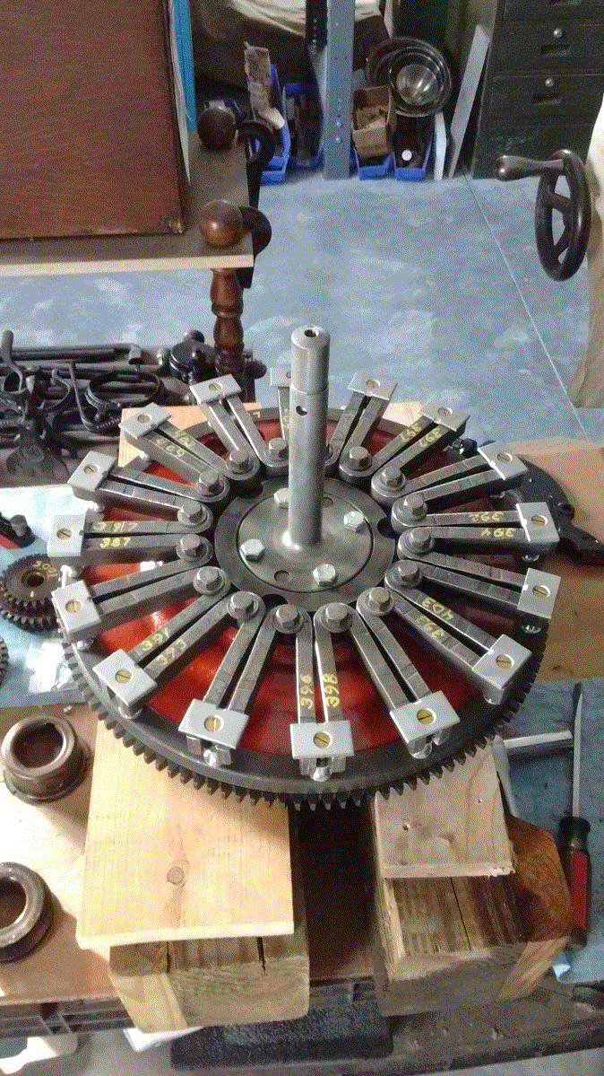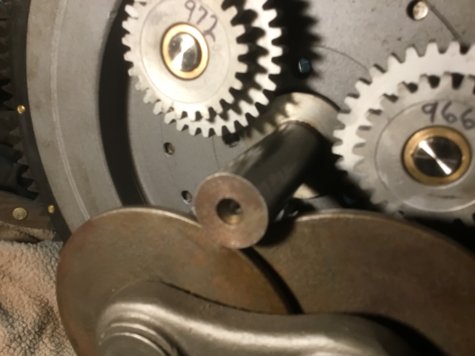 OK, here’s the dill pickle. When the triple gears were added, everything went South. The gears are with in 8 grams of each other, but made a big difference in the balance no matter how I placed them. The balance improved by changing their location, but was still not acceptable. I’m thinking the gears and flywheel must be balanced as an assembly. And if you really wanted to do it right, Mike Bender’s set up which includes the crank and tail shaft is probably the best.