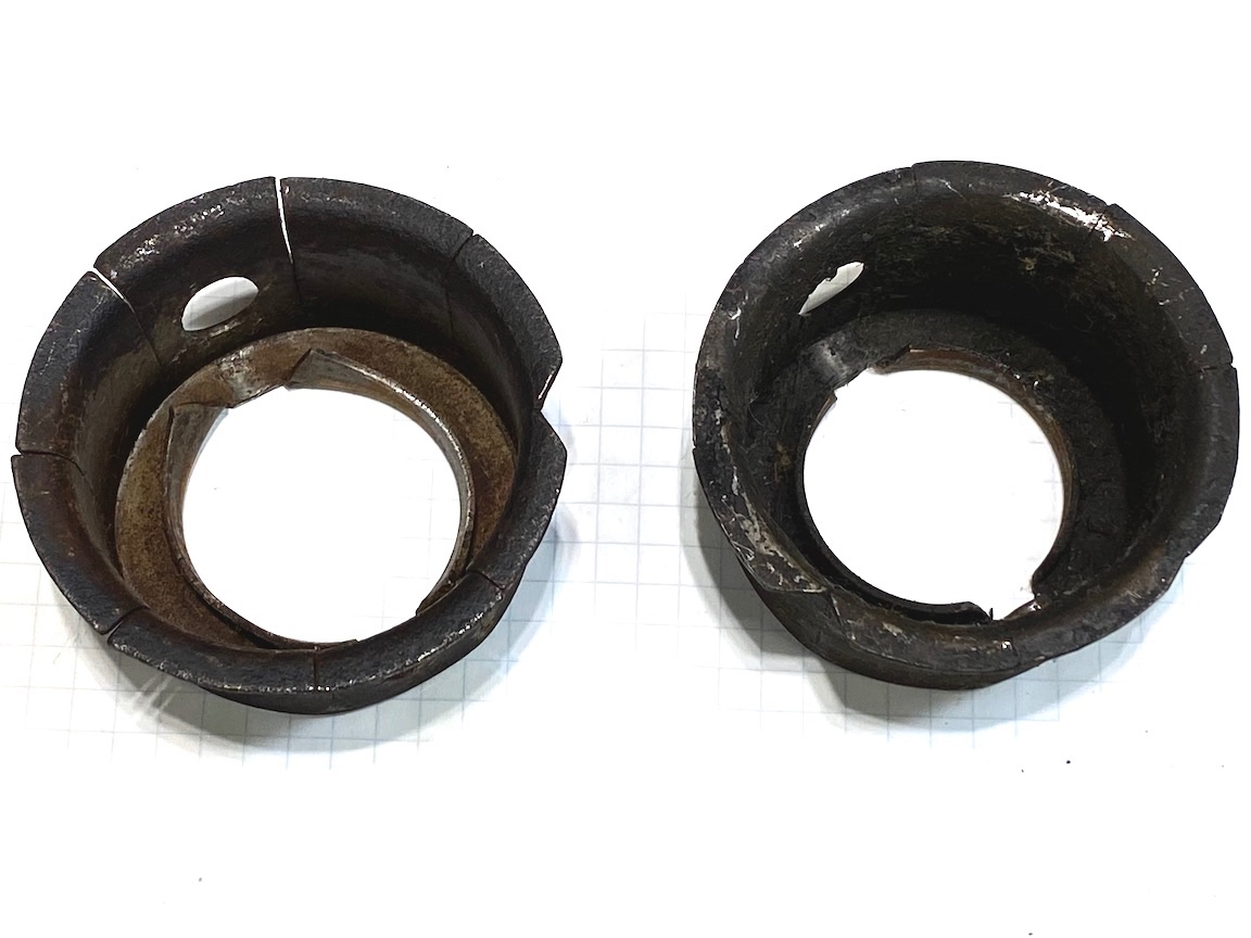 The big cup-to-fourth main clearance in my speedster remains an outstanding question. It could well be the spring cup is out of position. What threw me off was assuming the pin, when seated, is in line with the cup holes (no 45° twist required). Photo 4 shows the two spring cups I have in my used parts — both of these the holes and the pin seat are aligned. Are there other configurations for this part?