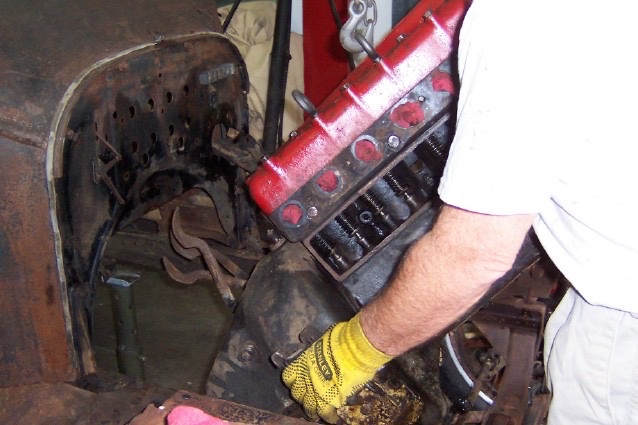 I purchased a pair of lift rings from one of the vendors. I attach the lifting chain from a cherry picker to the rings which allows me to tilt the engine easier. I asked an old time engine rebuilder about the safety of lift rings and he laughed and said you could lift a whole car with one. When pulling an engine, I either remove the firewall or at least free it so I can raise it high enough to clear the pedals. The radiator has to go and I pull the headlights so they don't get damaged. I also usually remove the steering shaft. It's a pain, I know, but with the exception of the 26-27 cars is about the only way. Get some guys to help you.