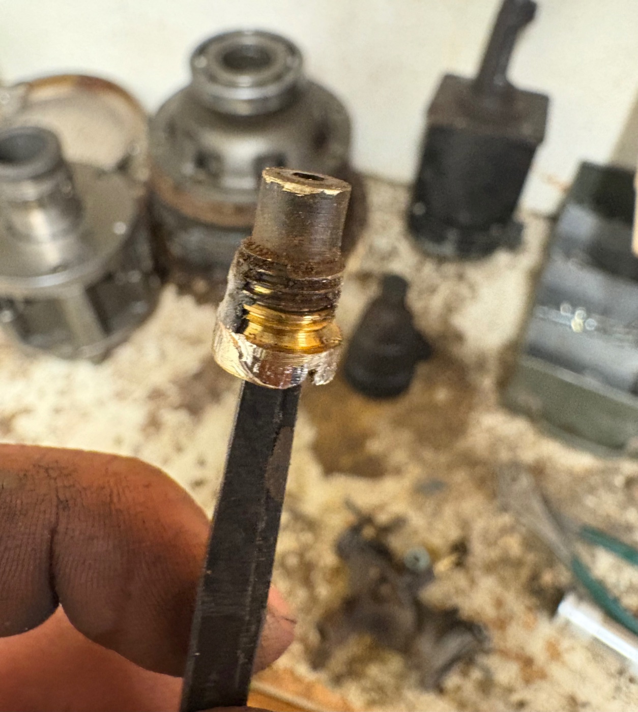 How does THIS happen? ....Someone decides to replace a leaky needle & seat unit. They put an ill fitting seat removal tool, like a worn out screwdriver blade. Then chew up the seat notches, so it cant be unscrewed. Next they try a screw extractor. It wont bite & expands the seat making removal impossible. Next they try drilling the seat out, but ruin the threads. Last chance, adapt another seat from some other carb.