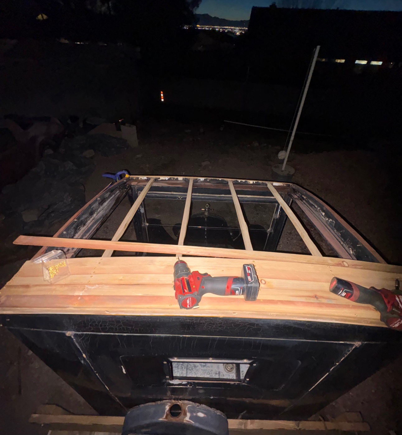 This past weekend I spent about 11 hours and around 200 bucks in materials putting together a new roof for my TT. I used all hand tools to do it besides a drill and impact driver since there were over 300 screws to be set. Other than that, all pieces were hand cut with a cross cut saw. Overall, I think it turned out pretty nice. I also took some time refinishing the interior wood as well. Next, I will be making new body mounts to replace my old ones. I will also be staining the inside of the roof black when I get a chance. The top I sealed with some sealer. Now she’s ready for some new vinyl up top. What vinyl would you guys recommend me to put on it? I will post pictures of my work below.