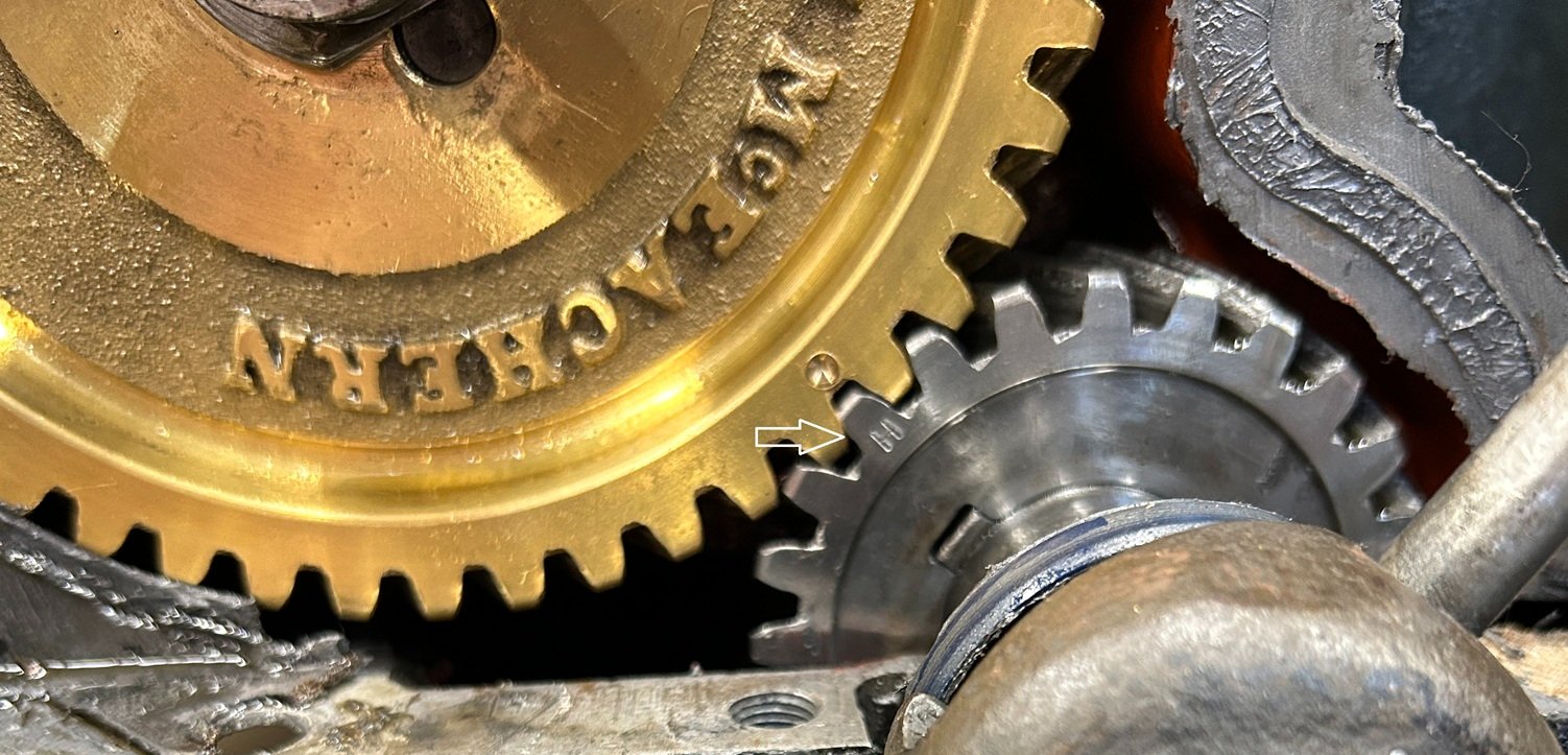 Here is a possibility that John and I discussed. See the photo of the 2 gears, which for all practical purposes are new, due to the rebuild. Note that the dimple in the brass timing gear and the alignment mark on the Scat crank are aligned, as they should be. Have any of you ever run into the situation where one of the spots got “mismarked” during factory production which could put “perfect timing” “one notch away from perfect timing”? A single notch could possibly effect TDC to the point of a "misfire", but not one that a human can feel. Has anyone ever had that situation? Not me, that I know of anyway.