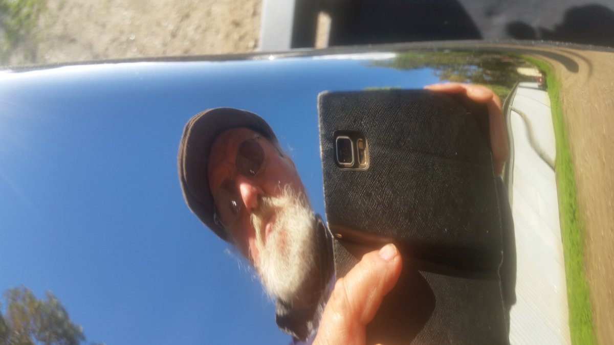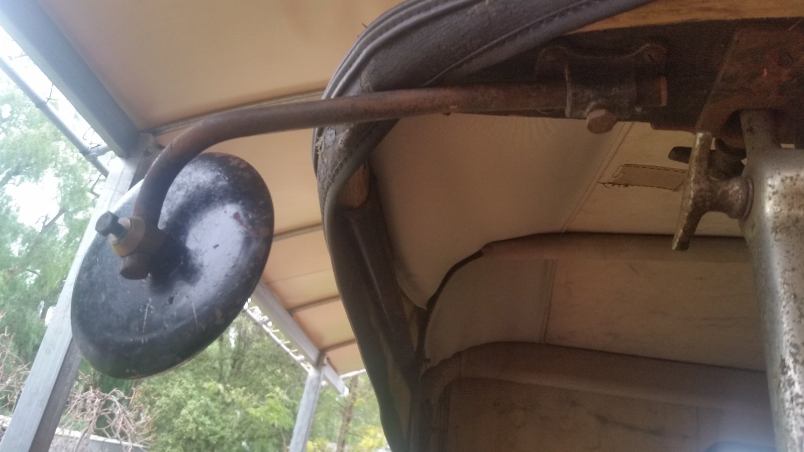 When the tourer top was modified for the buckboard conversion, the top no longer folds. Mounting the mirror to the front bow filler board gets it up out of the way.