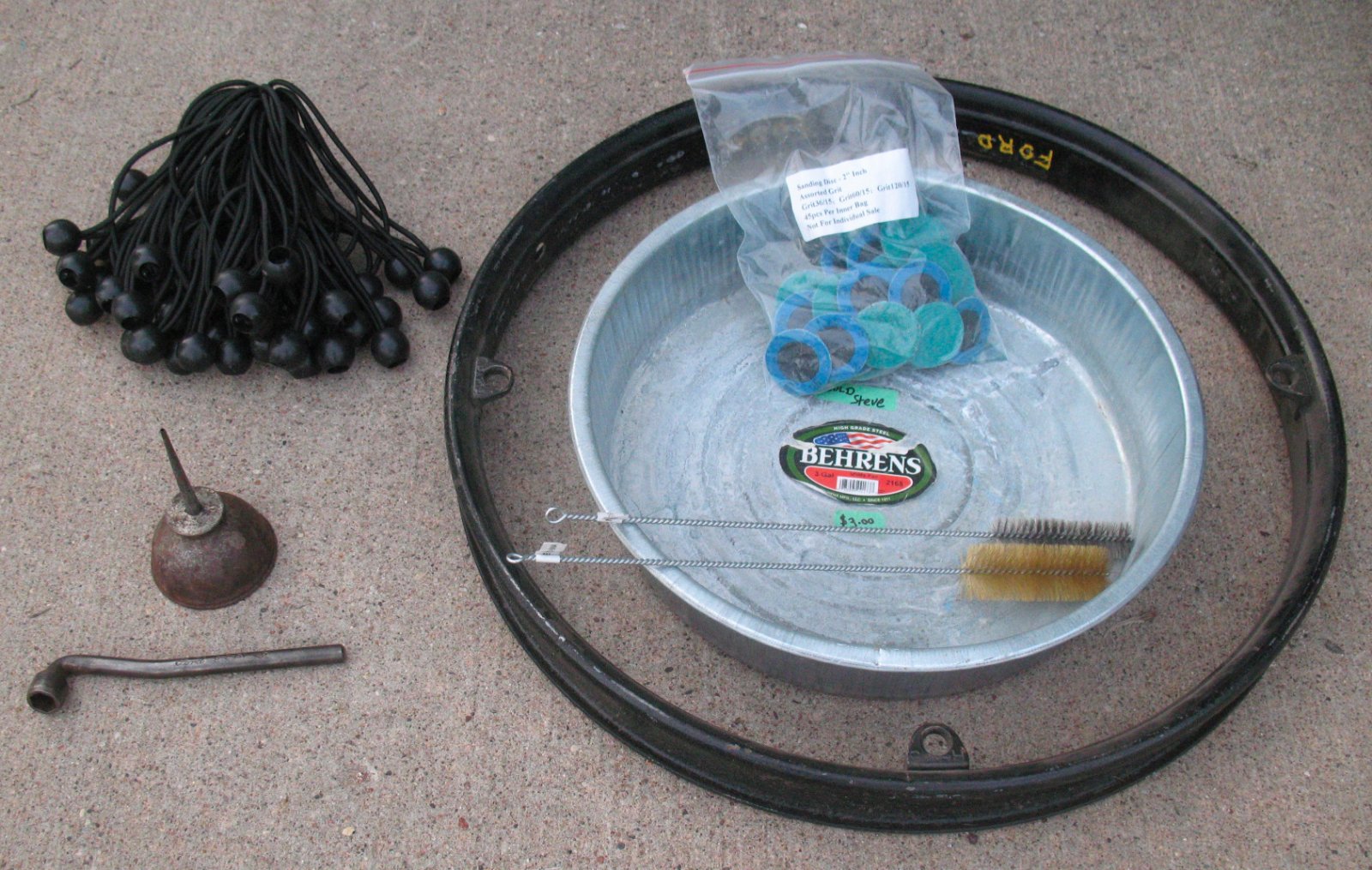 Today: A good Hayes rim, NOS oil pan, 2" abrasive wheels, two wire brushes, and (not shown) an original New Day cover for $1.