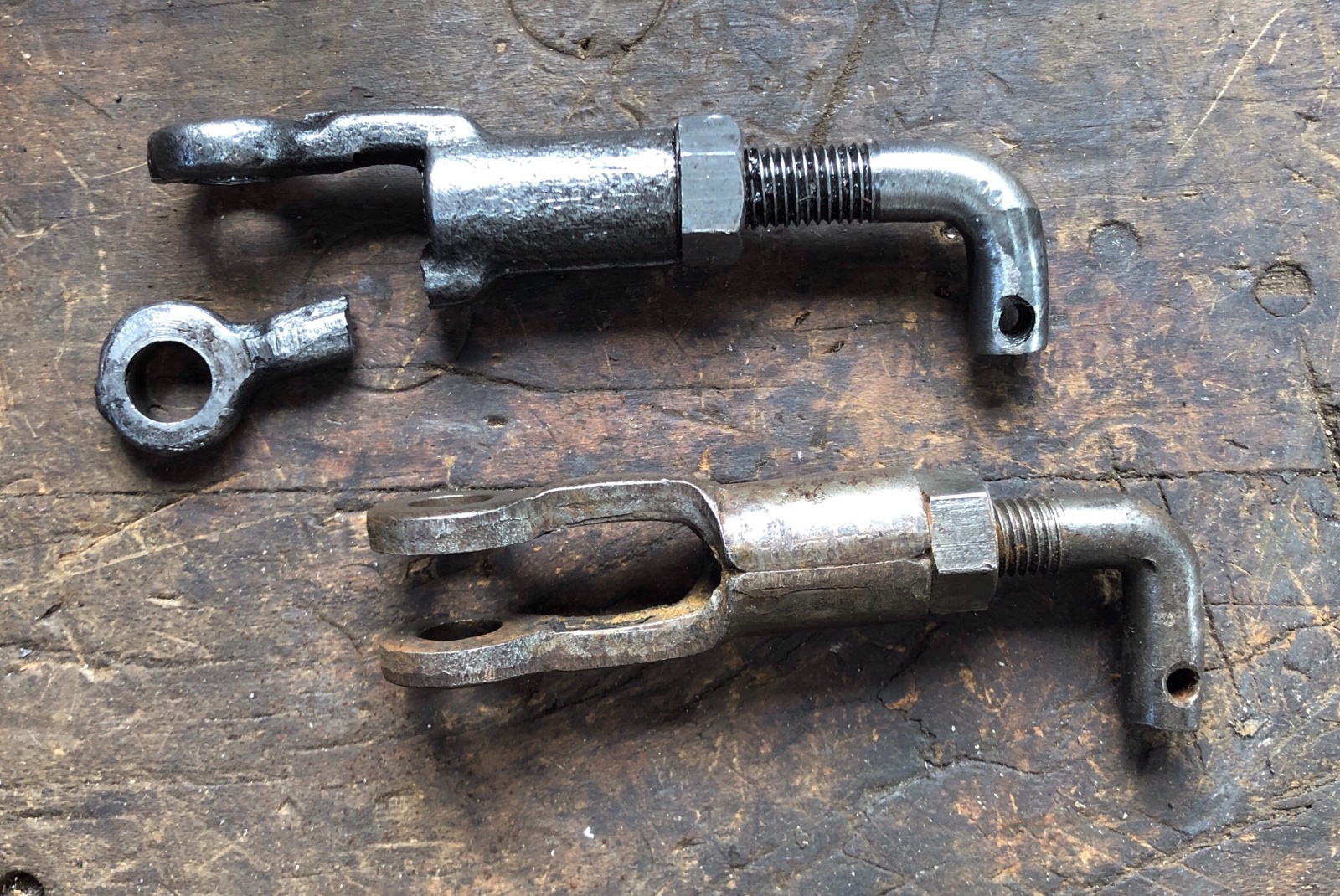 Steve, I agree the broken piece is earlier. I do not know when the rolled steel type were introduced. However, I believe this broken one is a cast reproduction, rather than an original forging. A forging will bend considerably before it will fail. This one shows no distortion before the failure, just a clean break. The nut and L piece also look quite new.