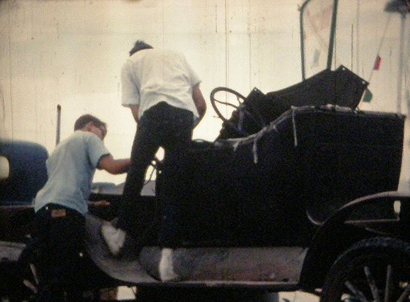 This is Rich Bingham and I in 1964 with my first T on the trailer. I traded Rich the Runabout body for a Touring body. The same chassis is now under my Tudor. The photos were snatched from 16mm film my Father took. That would be 55 years ago. It is a 1925 T.