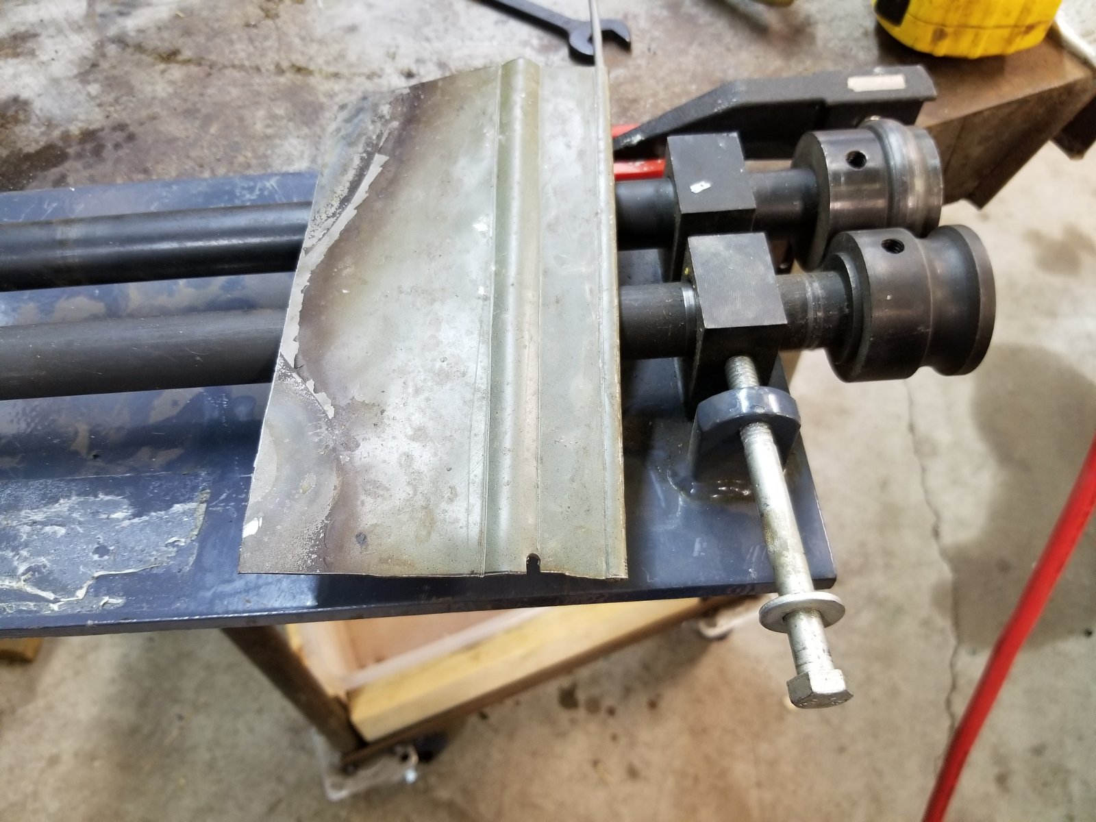 The scrap I used was a tad thicker than what tim sent home with me but not much. He also sent an original MP fender for a pattern. My fenders on the 8in1 are fastened different on the ends but the rest is the same. After some measurements and turning the cranks for a while, I think I may be able to do this. 1st I went through the process of making the L on the edge. Then some clamping and hammer action and final run through wire bead roller the wite was in the edge. Then on to the bead roller for fender bead. I will need a larger diamiter roller but I have the general shape figured out.