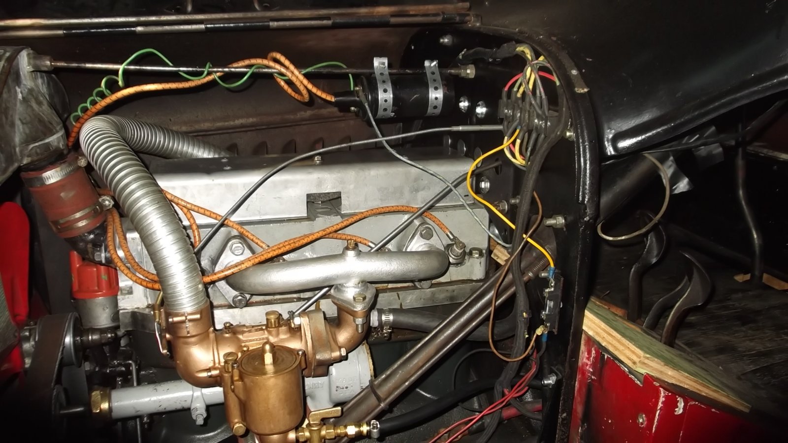 I am running the modern rubber type fuel line all the way from my tank to carb. Two weeks ago my electric fuel pump gave out. I did not have time to source a 6 volt pump so I mounted my tank in the bed of the huckster. With the Chevrolet over head the carb is on the drivers side so the line runs along the drivers side (US). I could have put the tank lower then how I mounted it but wanted to be able to drain if needed.