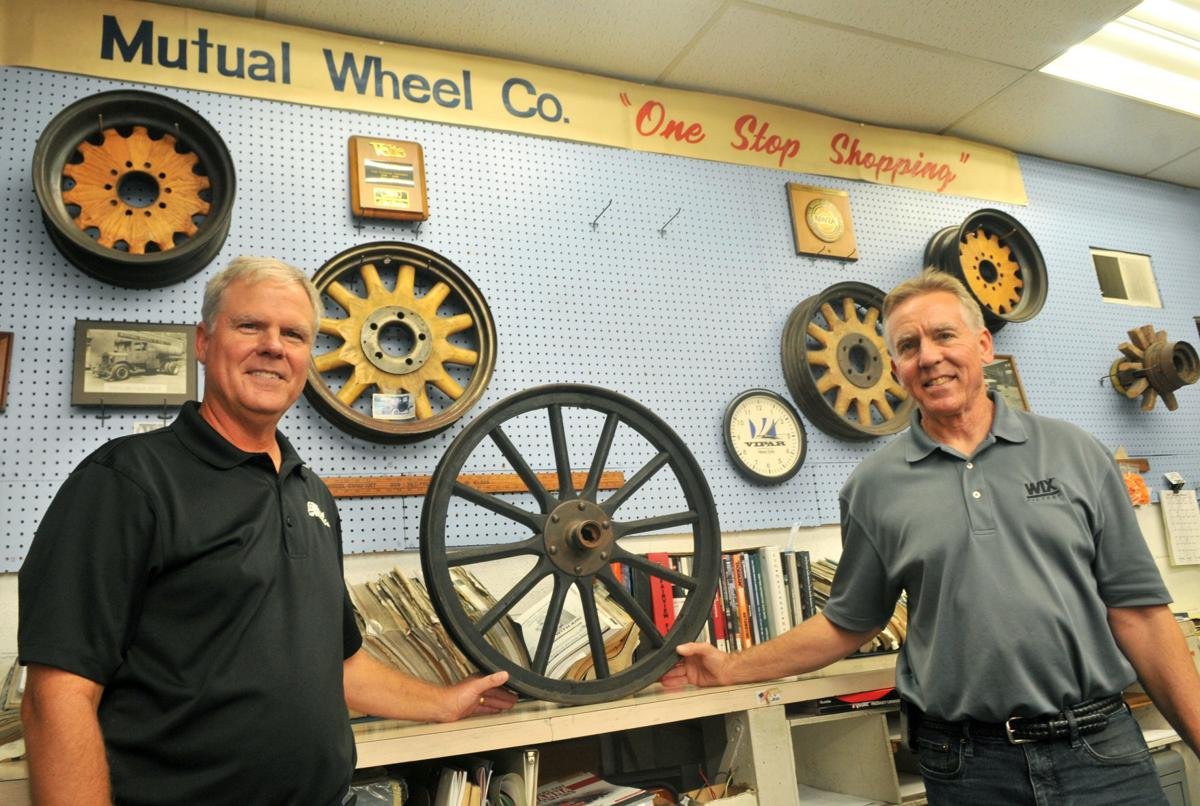 The style of wheel looks like some made by the Mutual Wheel Company in Moline IL. They have been in business for over 125 years. The company's early history can also be tied to a sometime forgotten , but fascinating period in Moline's history, when the Quad City area earned the nickname, "Little Detroit". Nineteen models of motor vehicles were built in the Quad Cities prior to 1930 (Gale. Deere-Clark, Midland, Moline -Knight,etc), , and Mutual Wheel Company made wooden wheels for many of them. Still the Headquarters of Deere & Co with manufacturing facilities in the surrounding area
