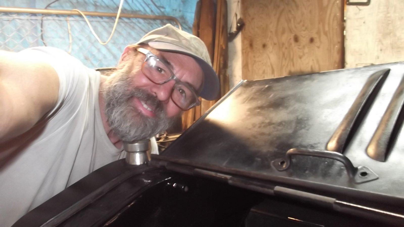 Erik and his father Bob Johnson stopped by to see my 1913 Runabout. Bob originally found the car beside a barn in dilapidated condition back in July 1951. B/W picture of him behind the wheel after getting the remains running. He sold the car and after 68 years and several owners (plus a “re-body”) he was reunited with it.