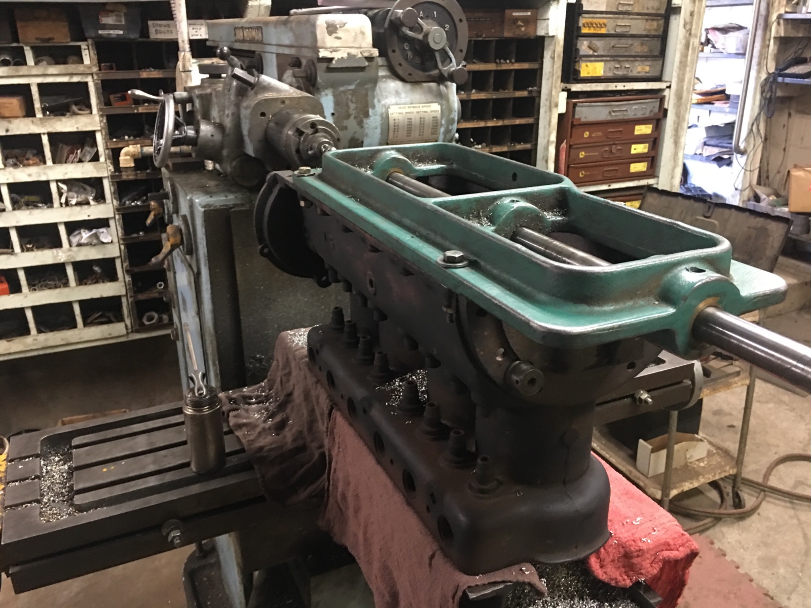 The block is clamped down through the cylinder bores. The rags are there to protect the deck surface from scratching. The mill drives the bar with a flexible coupling so perfect alignment is not required, but I get it close. This block has been opened up to use babbit on the upper main bearings. Originally it would have run the crank in the iron bores.