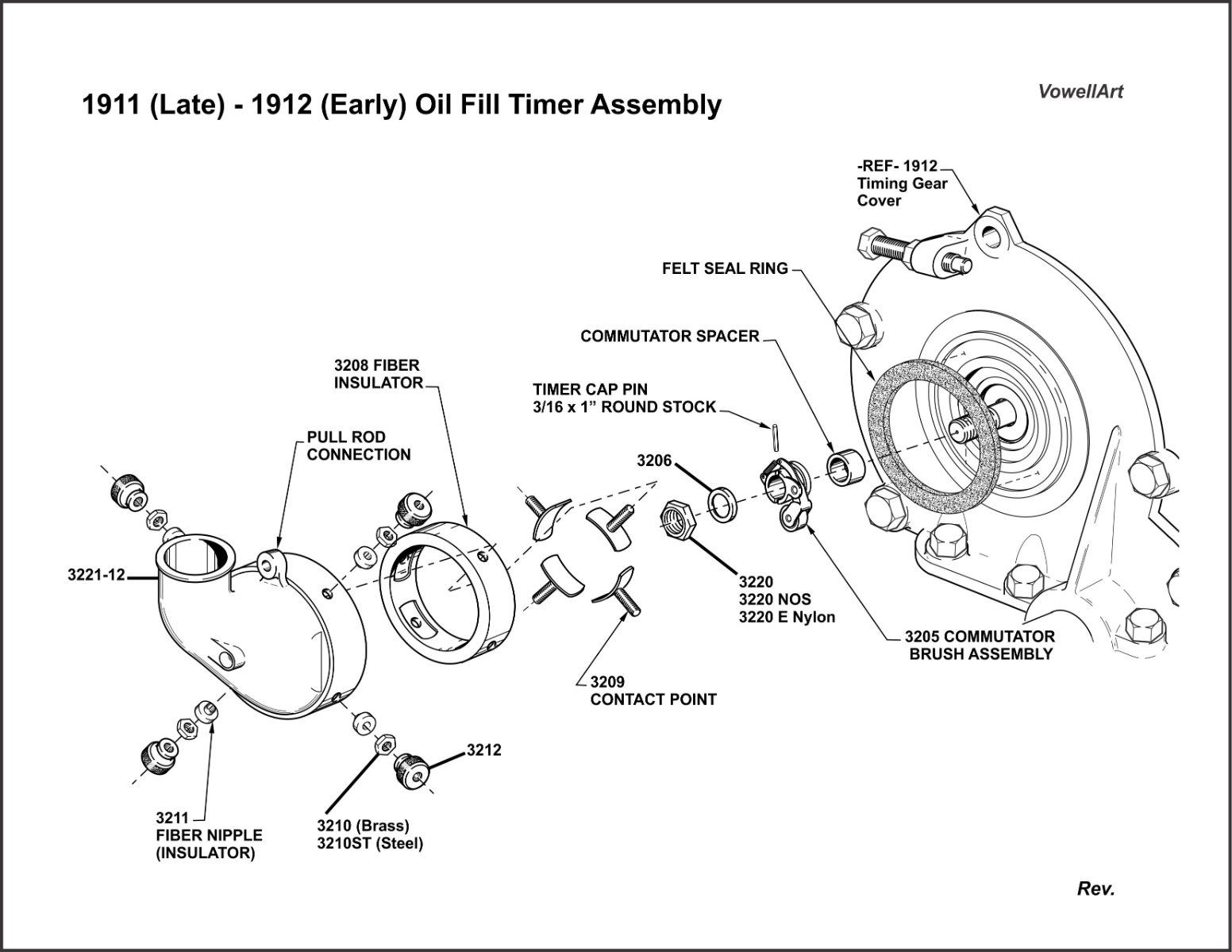 Ummm, Bob, what year is that timer, because that isn't the one in my drawing, that's a standard looking Anderson with a later model timing cover. The 1912 Timing cover that was used for the Oil Fill Timer here has no oil fill spout on the cover at all, the fill spout and the timer are the same unit, hence it being called the Oil Fill Timer and the timer not only oil in it but was the only means by which you can add oil to the engine at all.