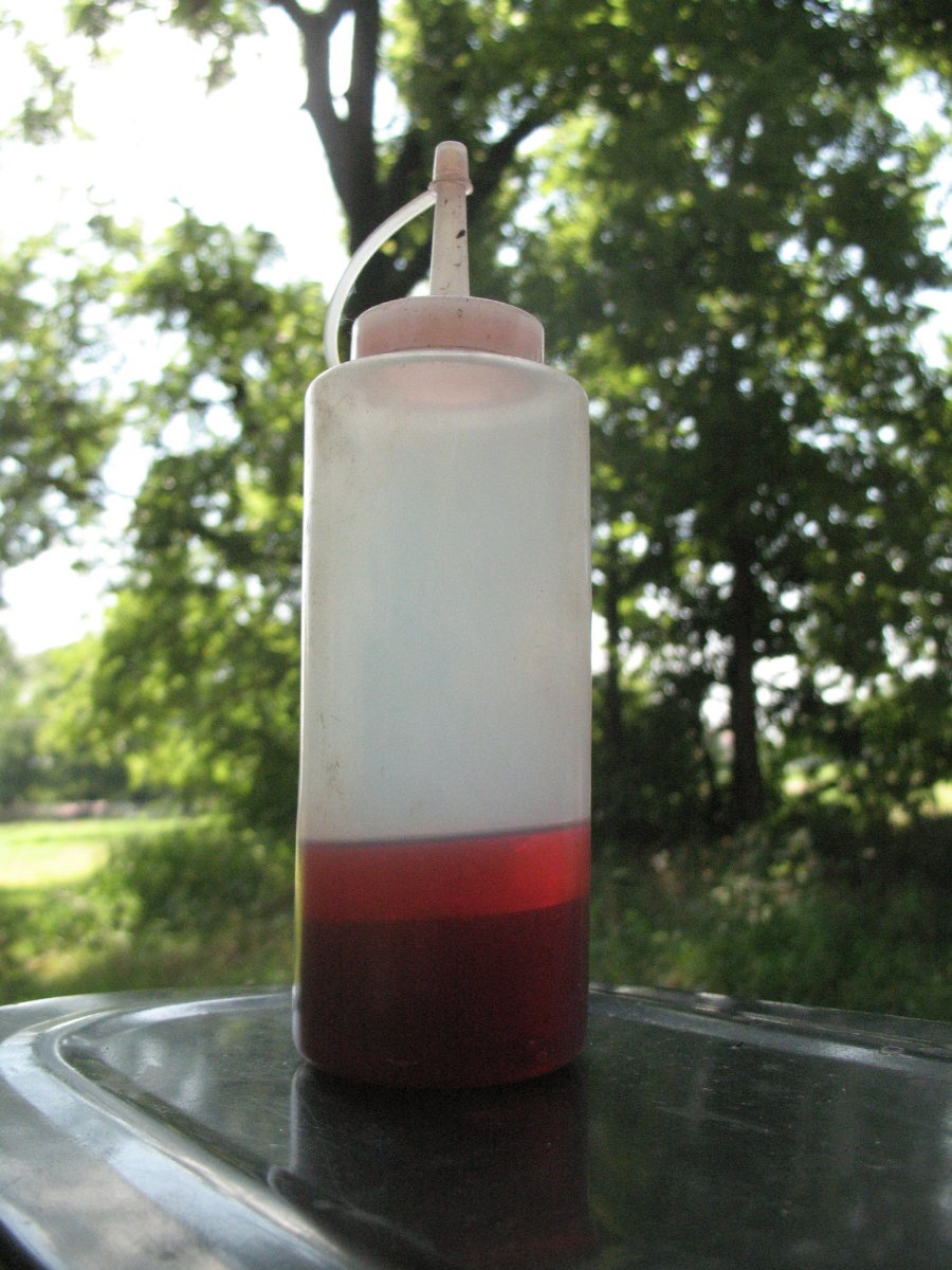 I keep the mix in a capped squeeze bottle to retard the evaporation and so I can shake it up before I squirt it on. So much acetone has disappeared from this batch that I'll need to add more before I use any more of the mix.
