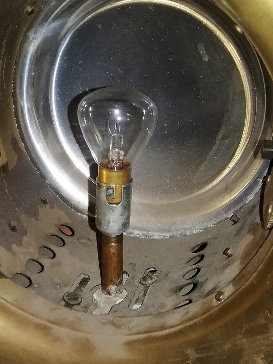 We converted the acetylene lights on our 1913 T to halogen a few years ago. Sockets and bulbs were purchased off of the internet at very reasonable prices. We removed the original burners and made socket holders on the lathe from brass. The socket is 3/4 of an inch in diameter and the socket holders are threaded on the bottom end and screw onto the original burner stand. An original, period runningboard tool box was purchased from a forum member and it is used to hold a 12V deep cycle battery.