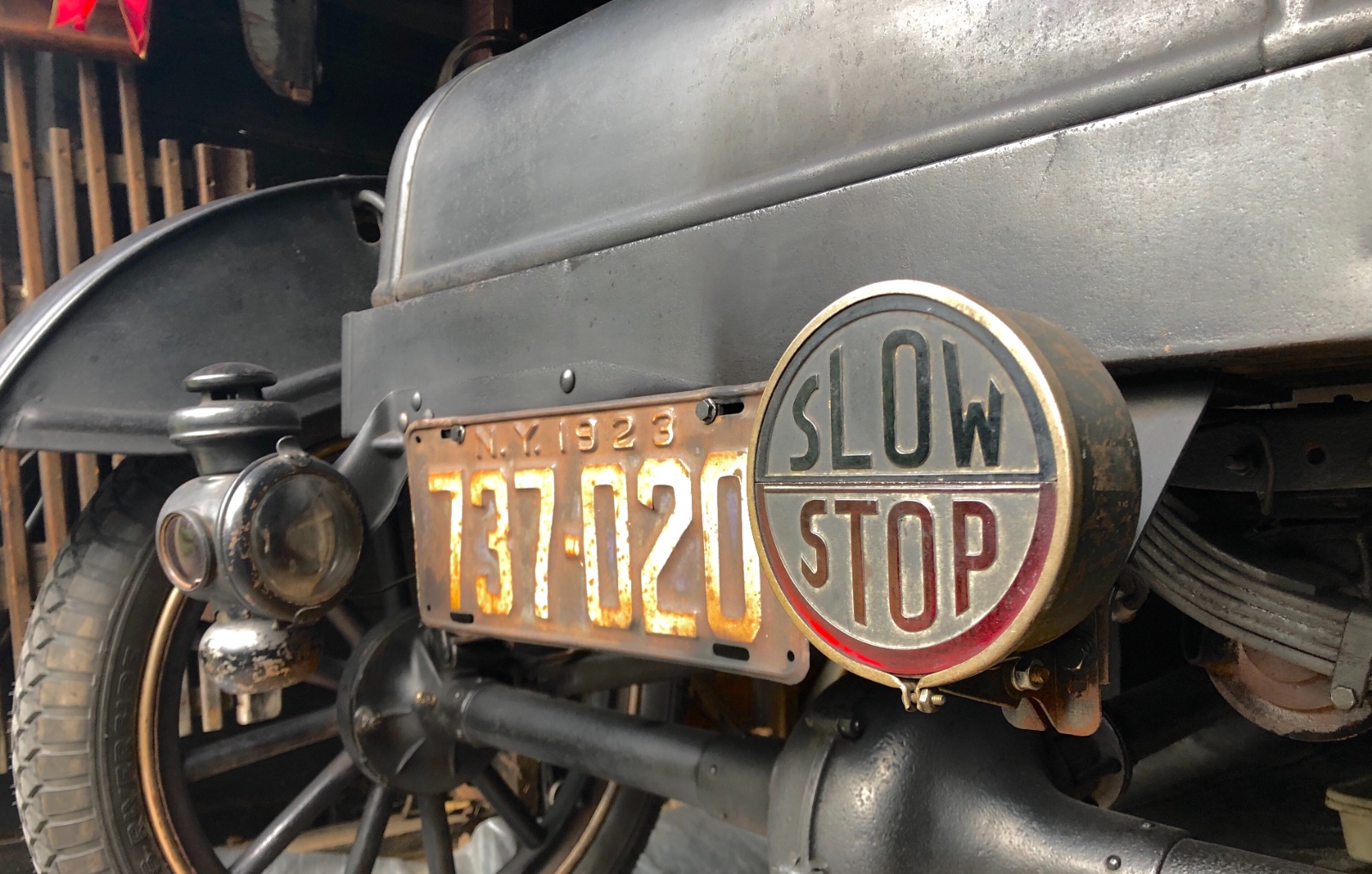 Professor, it is my understanding that a single red marker light was supplied with the beginning of electrical equipment in 1919. For modern safety there's no reason not to keep your double lights for night time driving t add a era style stop light right in the middle of the spare tire carrier and use a modern switch from one of the vendors. Does Massachusetts have an extra tax for having safety equipment?