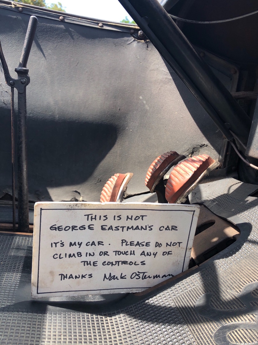 I drive my T to work nearly every day unless I have a lot to carry. The visitors to the Museum often think it’s George Eastman’s car. Strangely .. when they think it was his car .. they often think it’s ok to climb into it for pictures and even open the hood! So I put this sign near the pedals before I go into the building.