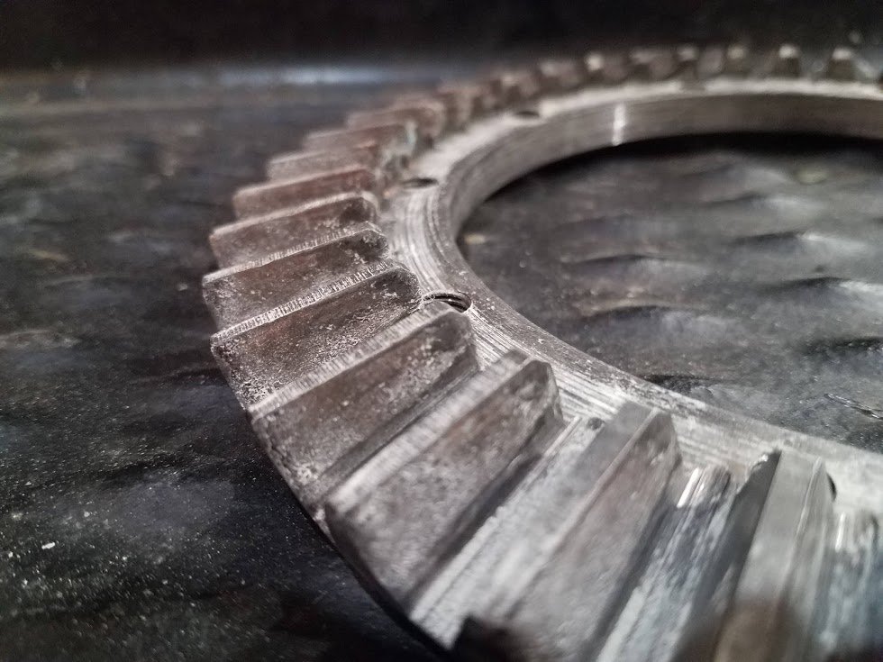 1) That ring gear shows obvious signs of skipping over pinion gear teeth. It is beyond any further use. This is the cause of the terrible noise in the original post -SKIPPING TEETH. The noise sounds and even feels like it is right under the floorboards, but it is not the transmission! In the original post it was stated that the noise occurred while braking, trying to reverse, or under acceleration, but he was able to drive it gently as long as not climbing a hill etc. Classic gear skipping probably due to worn thrust washers or thrust surfaces if the pins have worn or sheared. The bad noise came from and is still coming from the rear end.
