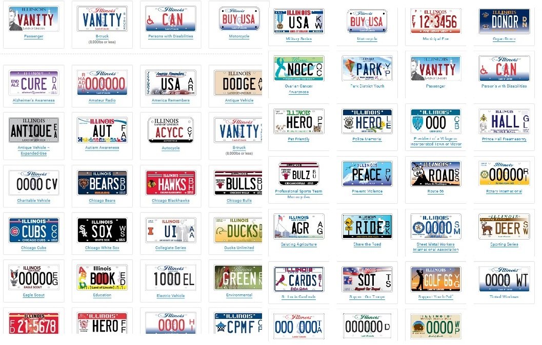 You should be happy that it only costs $25. Illinois fee is $101 for random numbered plate (renewals just get a sticker)- but if you want to support an ideology there are about 70 various designs to choose from (at additional cost). Here are just a few...