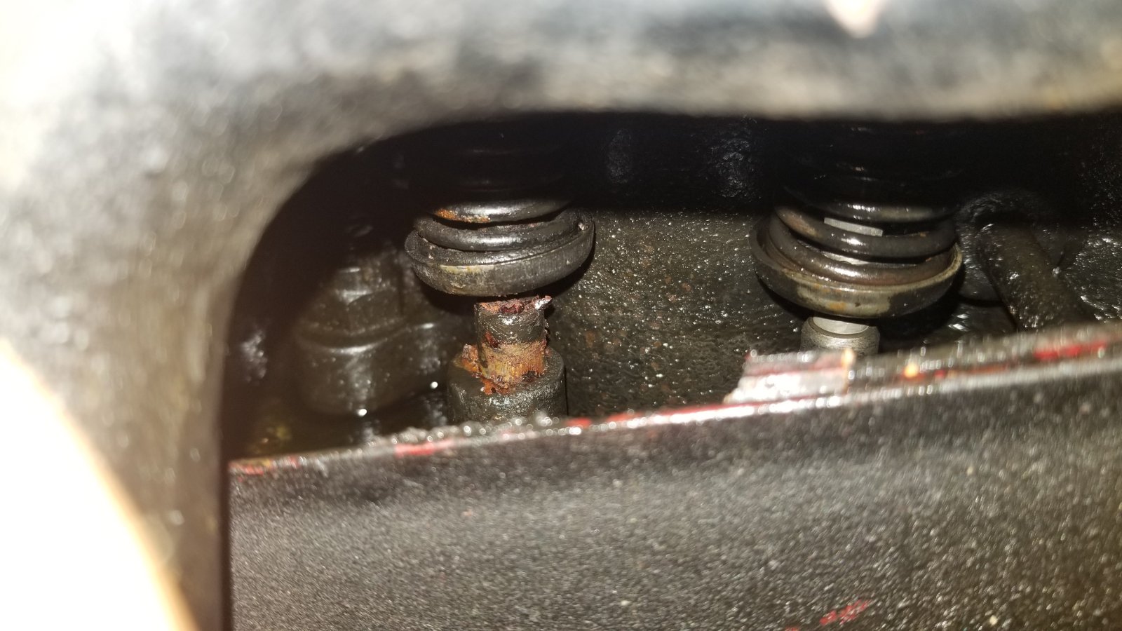 We decided it was time to remove the head and have easy access to everything. Head came off easy, inspection of the head gasket showed possible water infiltration into combustion chamber. I'm not the best gasket reader, but it wouldn't take much to cause the rust I'm sure. I pulled the valve spring off the valve over the stuck lifter so we could pull the valve and tap directly down on the lifter. Problem was, valve wouldn't budge. At this point I decided saving the valve was not necessary as that is easily replaceable. I grabbed a pliers and wiggled and pulled and twisted and grunted until she finally pulled up and out. The top of the stem that does not go into the guide was so rusted and corroded that it is less than a quarter inch diameter. The guide portion looked pretty good. It was also bent near the top, possibly from trying to push it down through the spark plug hole, possibly from me twisting, possibly because it looks original.