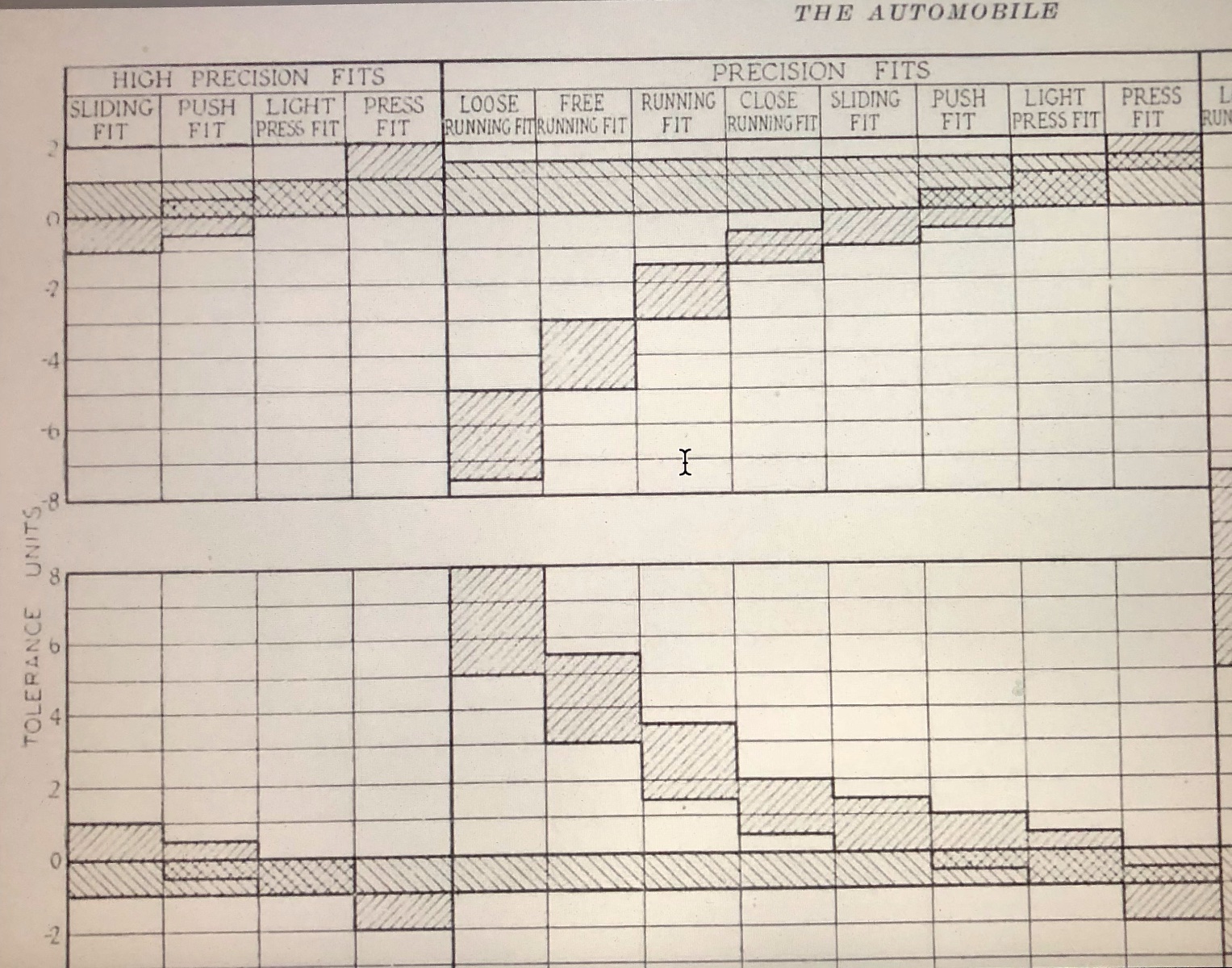 Regarding the Chart that Dan provided, the upper left portion is tolerance for Hole Basis, while the larger portion of the chart is for Shaft Basis tolerancing and it represents the GERMAN basis for fits. This chart is difficult to use and was not fully incorporated for use in USA at the time.
