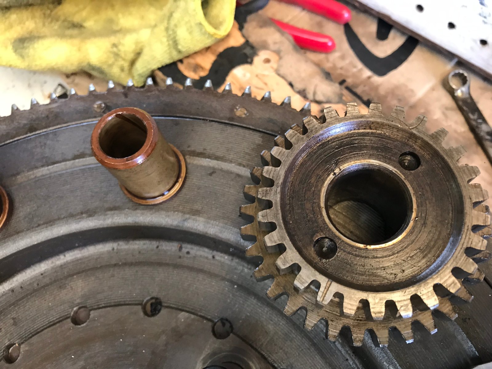 I've never seen a bushing wear so thin as the one that has left only the thrust remainder on the flywheel, nor have I seen a spun gear wear out the bushing quite like it did. Often times, even silent transmissions have a bushing welded onto the pin and spinning happily within the gear. This looks like a lubrication problem to me. Chicken or the egg...who knows?