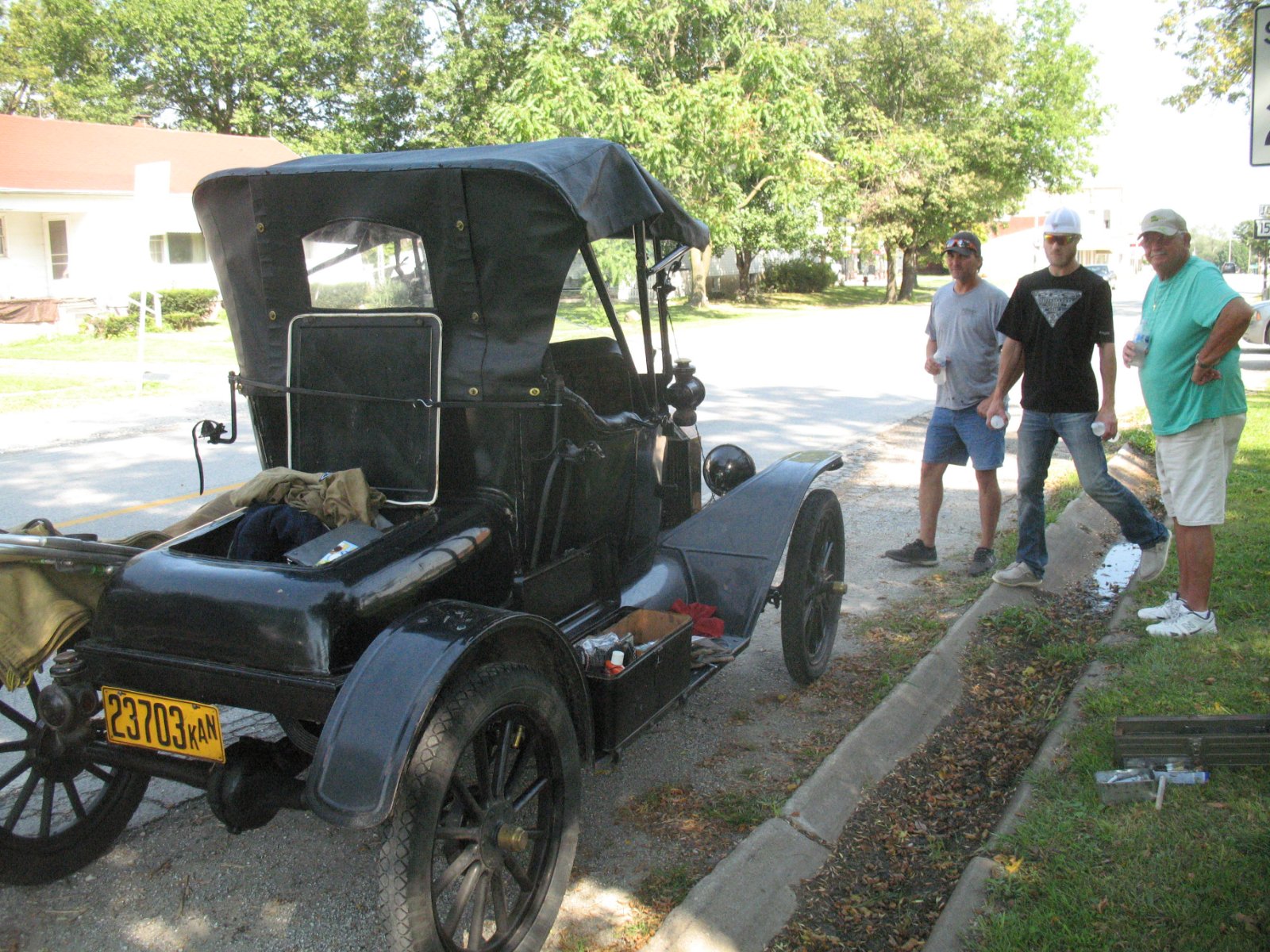 By the time I got to Madison the symptoms of fuel starvation had reached the point where I had doubts about getting to the next town, so I pulled off under a tree and set about an investigation of the carburetor. This is the first time I've used a Holley G, but I seemed to remember that proper float valve setting is not by measurement, but by removing the top plate and watching to see that the little pipe inside is sticking down into a puddle of gas at the bottom. If there ever was a valid setting by measurement, using the new float material instead of the original brass probably cancels it. While I was working on the carb some local guys stopped to see if they could help. When I finally got the carburetor back together and on the car, Billy Cullom (on the left in the picture) did some of the cranking while I waited at the spark lever in case the car actually started. Eventually we got it to start reasonably well and I headed for Moberly. The car still isn't exactly right, but it now cruises much better, even on hills.