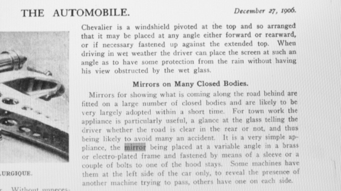 The history of the rear view mirror can be traced back to 1911 when Ray Harroun famously equipped his Marmon race car with a mirror at the Indianapolis 500—kicking out the riding mechanic from the passenger seat.