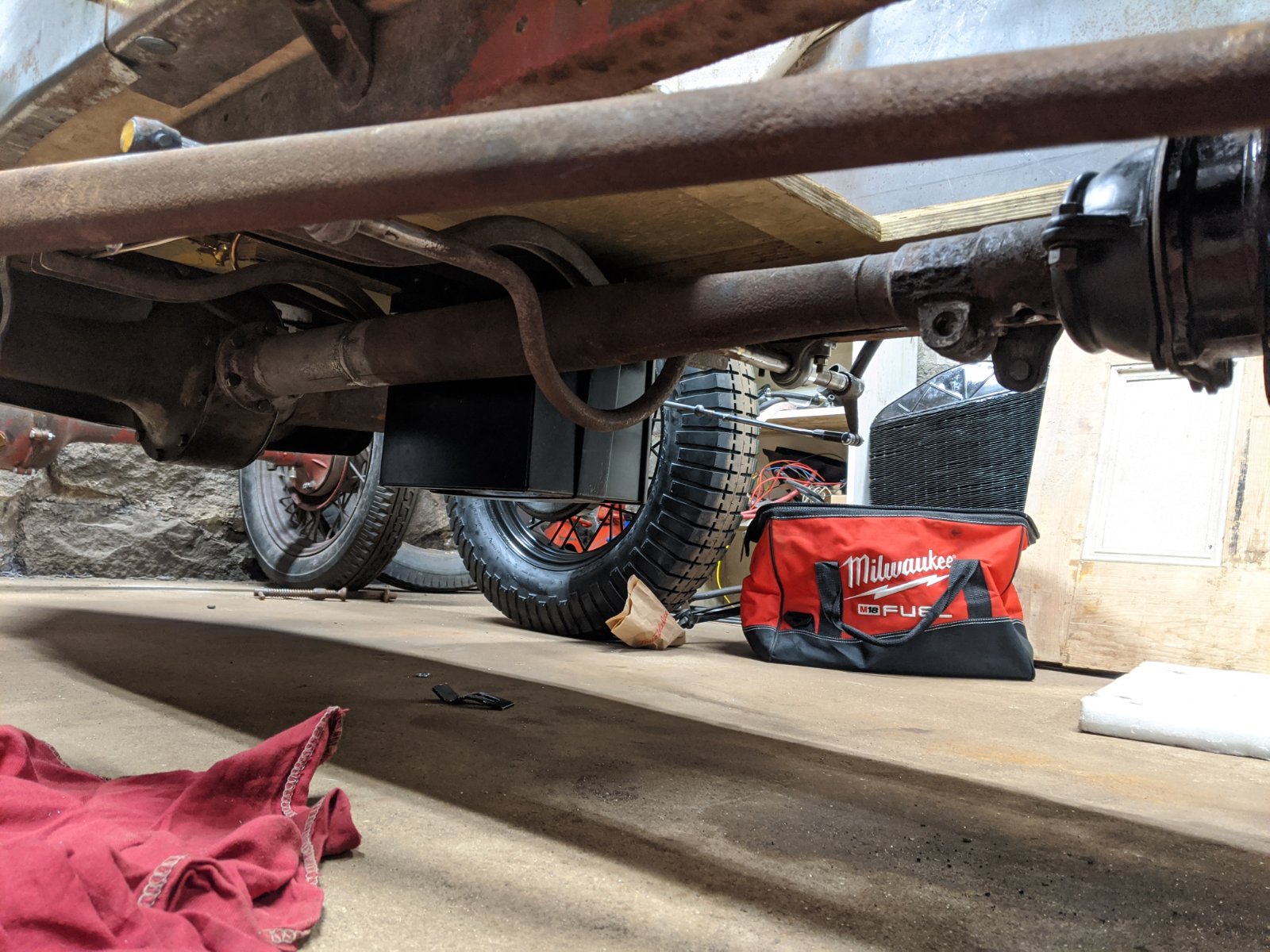 Rear axle rebuild, flipped housings, second rear crossmember added and spring moved ahead, torque tube shortened, aluminum over under Warford installed. Custom Chevrolet spacers added to clear Rockies.