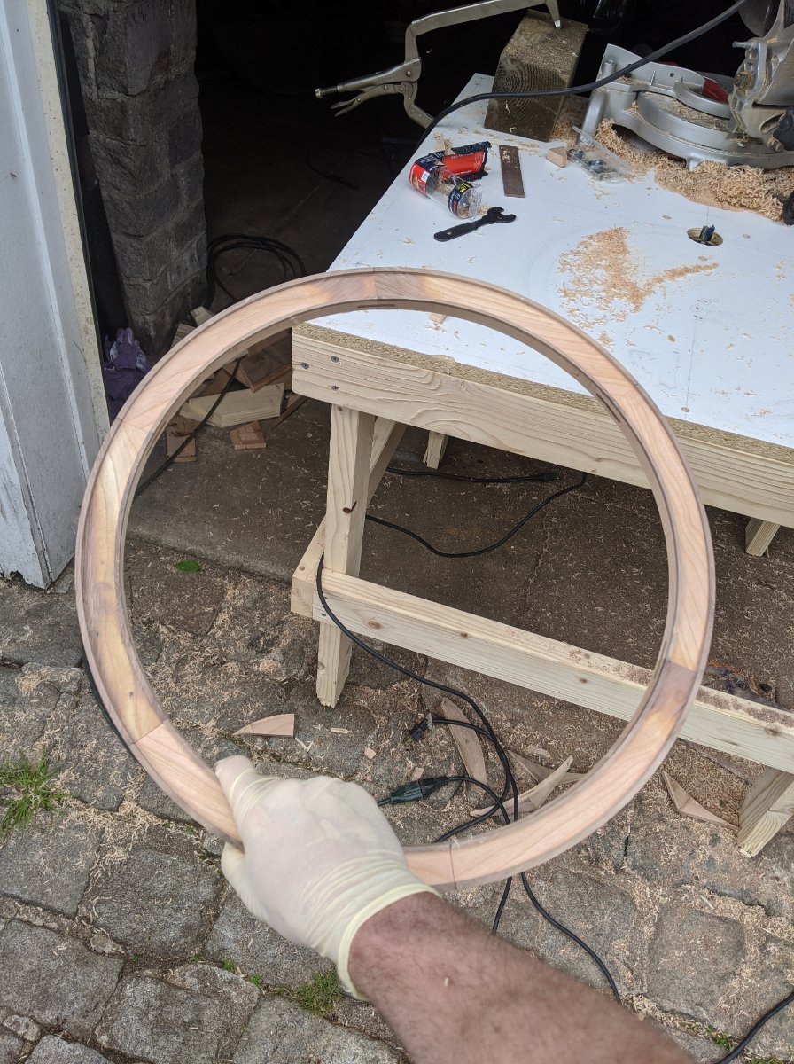 Chisel out the spoke areas so the wheel sits in the rim and here we are!