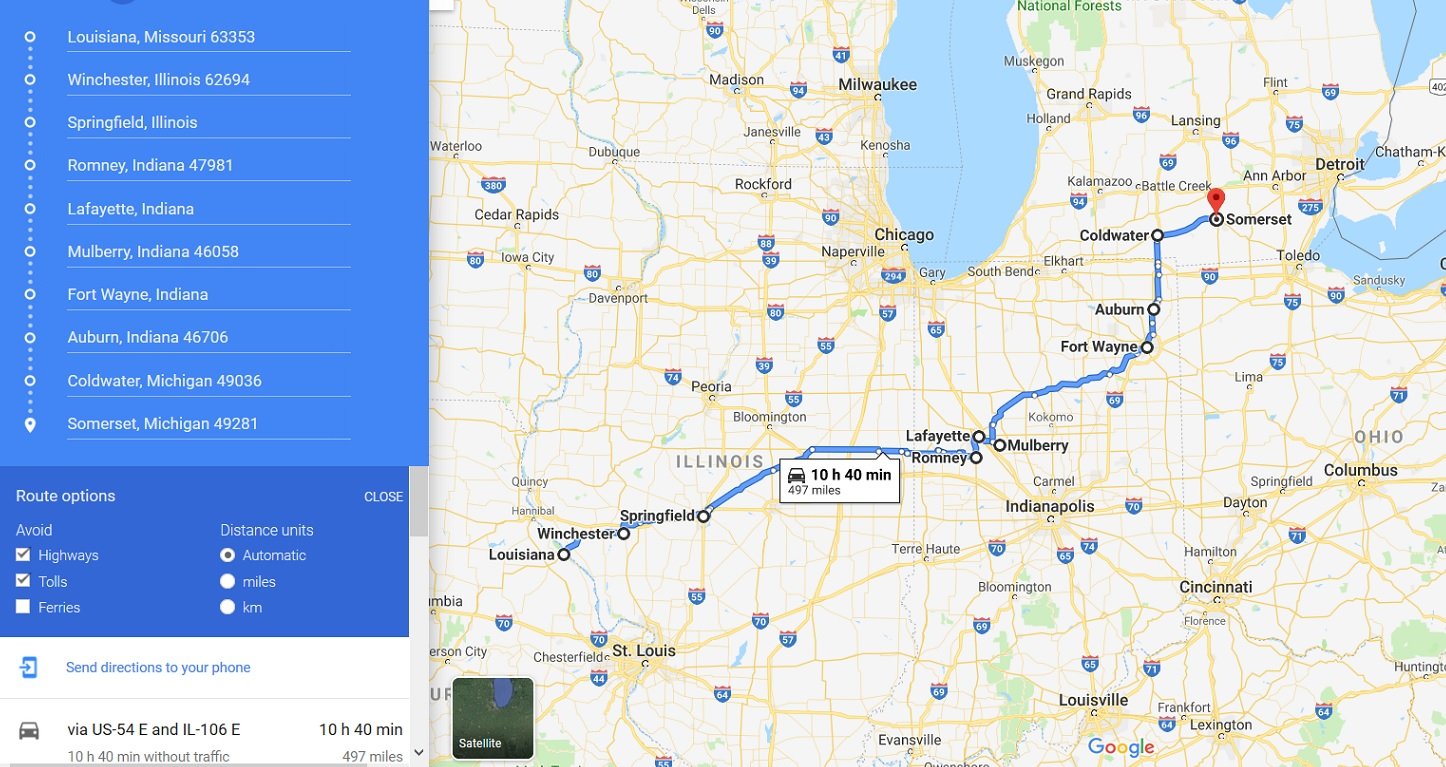 To Michigan via Mulberry IN leg 2 leg 3 Back Home Made it