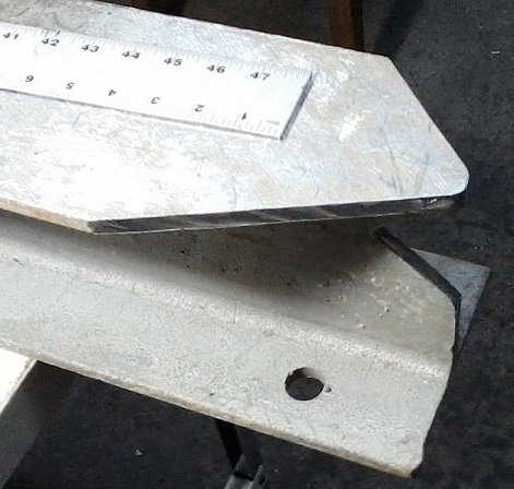 This is the homemade replacement piece. Here is the only original piece and the two I was hammering on today from scrap. The holes were enlarged after this photo. Measurements that I came up with are: 25" long, 1-3/8" face and 5/16" sides. No one makes these.