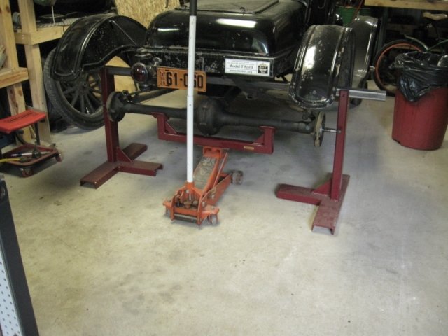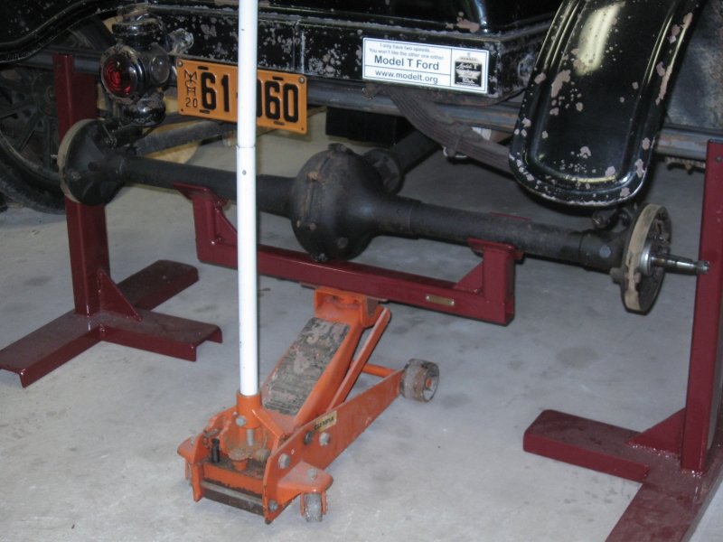 It also comes with a set of frame stands and a cradle for the hydraulic jack to lift the axle. The jack also has it’s own “extra” support for the front of the torque tube. This would be the only Model T part that was harmed in making what you see (it had 4 holes drilled in the base).