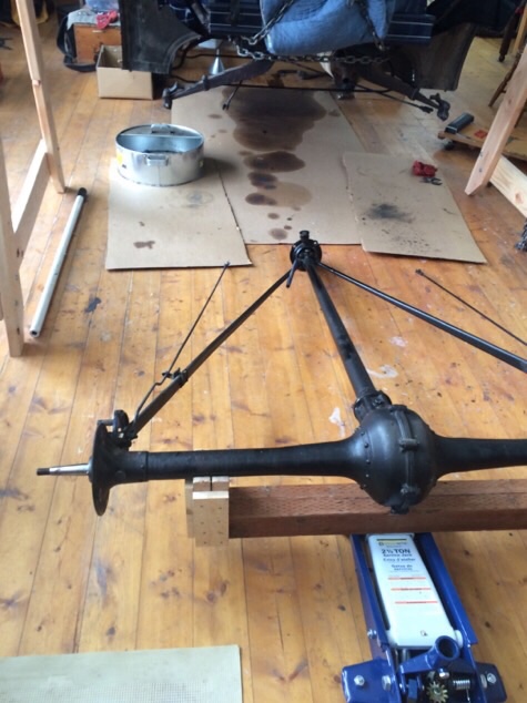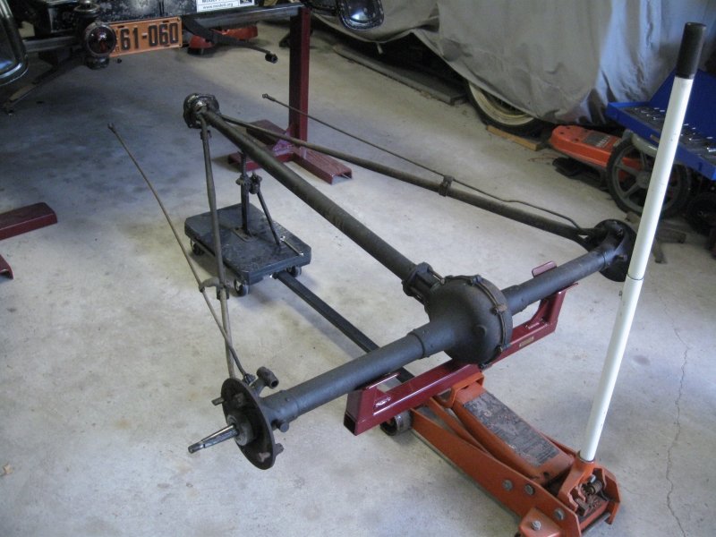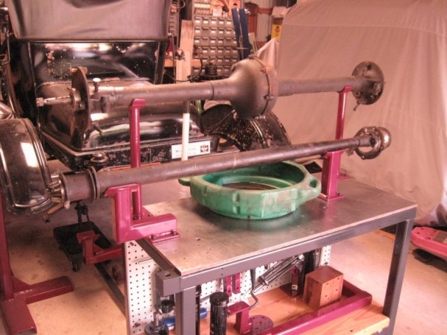 Getting down at this point is not the real problem, it's getting back up. I just physically can't do it like I did before. Forty or 50 years ago, on the ground and on the knees, dead lifting the whole axle assembly, etc., but that was a long time ago now. A couple of groups of photos have turned up missing somewhere between the camera and the computer, the set-up for removing and replacing the front drive shaft bushing and the ones for checking the backlash. If you look at the far right corner of the work table in the photo below you will see a short support (just under the zero in the license plate). That supports the front end of the torque tube when you are checking the backlash. The axle just needs to be turned in the holder and the torque tube will set across the length of the table to the support.Rich Bingham wrote: ↑Wed Oct 16, 2019 1:36 pmmy usual "down on hands and knees, in the mud, and the blood and the grease !" Thank you for posting.